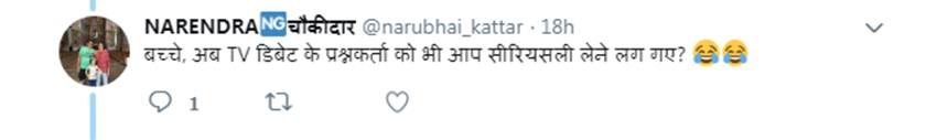 एक यूजर ने लिखा, “ऐसे लाखों पढ़ें लिखे बच्चे हैं जो सच जानते हैं, झूठे चौकीदारों को जवाब देंगे 2019 के चुनाव में अपनें ‘वोट’ से! जय हिन्द”। एक अन्य ने लिखा, “बच्चे, अब TV डिबेट के प्रश्नकर्ता को भी आप सीरियसली लेने लग गए?”