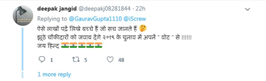 एक यूजर ने लिखा, “ऐसे लाखों पढ़ें लिखे बच्चे हैं जो सच जानते हैं, झूठे चौकीदारों को जवाब देंगे 2019 के चुनाव में अपनें ‘वोट’ से! जय हिन्द”। एक अन्य ने लिखा, “बच्चे, अब TV डिबेट के प्रश्नकर्ता को भी आप सीरियसली लेने लग गए?”