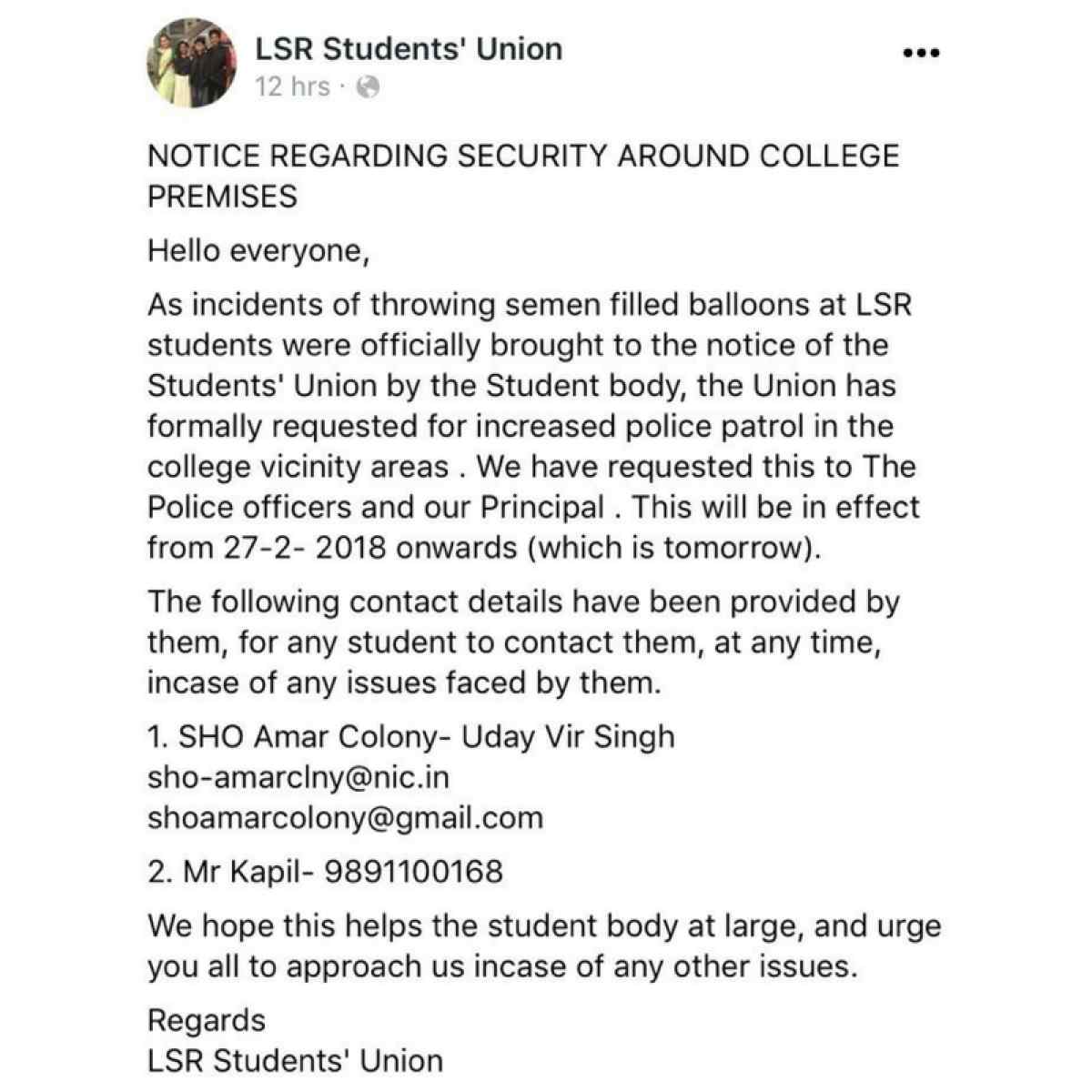 दिल्ली विश्व विद्यालय के मशहूर लेडी श्री राम कॉलेज की एक छात्रा ने बताया है कि होली के बहाने लड़के गुब्बारों में स्पर्म भरकर हमें मारते हैं। ग्रेजुएशन फर्स्ट इयर की इस छात्रा ने सोशल मीडिया पर अपना दर्द बयां किया है। इस छात्रा ने अपने इंस्टाग्राम पर पोस्ट लिखते हुए बताया है कि, ‘मैं अपनी सहेली के साथ रिक्शे से मार्केट से लौट रही थी। तभी मेरे उपर किसी ने गुब्बारा फेंका। पायजामे पर जहां गुब्बारा लगा वहां से अजीब दुर्गंध आ रही थी। ये तो साफ था कि ये पानी नहीं था। जब मैं अपने हॉस्टल वापस पहुंची तब मेरी एक क्लासमेट ने बताया कि उसके ऊपर किसी ने गुब्बारे में स्पर्म भरकर फेंक दिया तब मुझे एहसास हुआ कि ये क्या है। आज से पहले मैंने इस तरह की चीज़ नहीं देखी थी।’