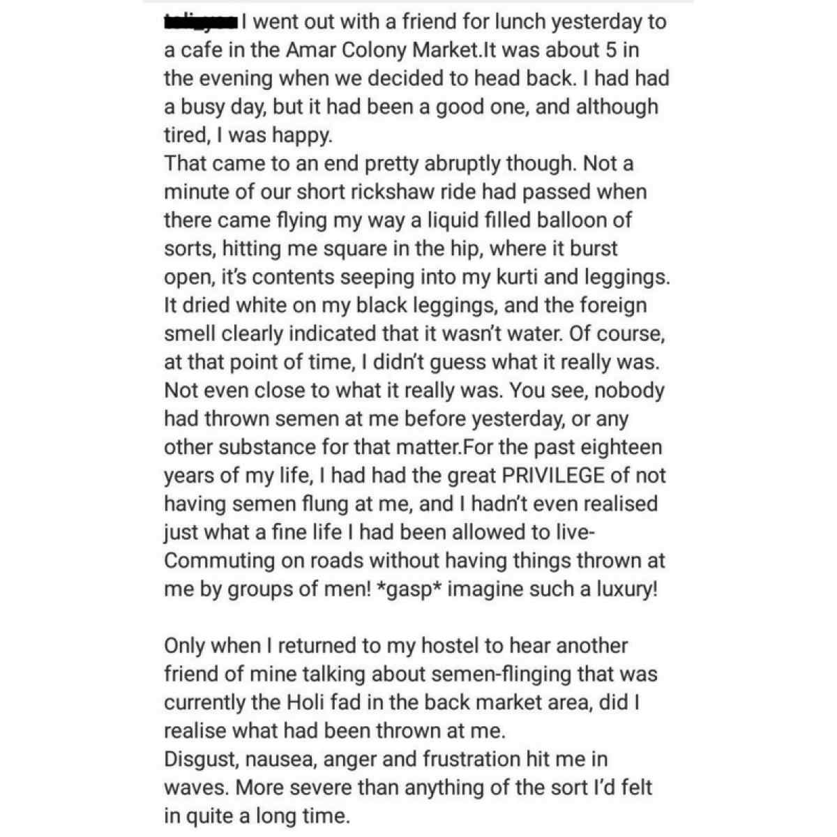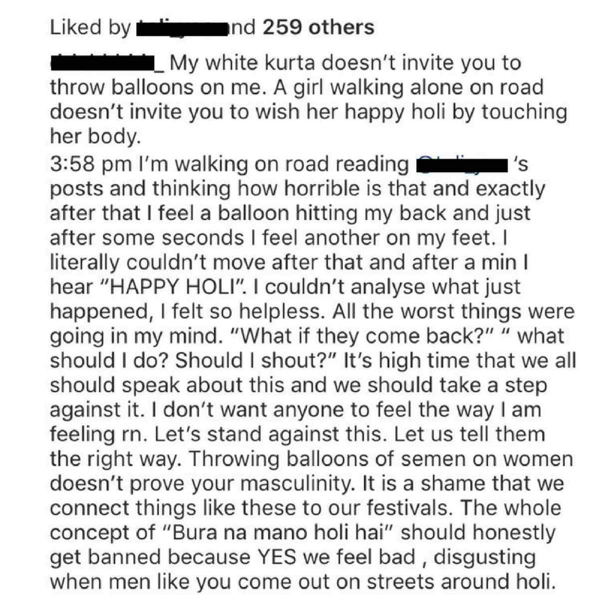 पीड़ित छात्रा ने लिखा कि, ‘इस तरह से होली के नाम पर मेरे साथ जिस तरह की हरकत की गई उसने मुझे अंदर तक झकझोर कर रख दिया। लड़की ने लिखा कि मस्ती के नाम पर इस तरह की हरकत किस कदर अंदर तक हमें नुकसान पहुंचाती हैं।’