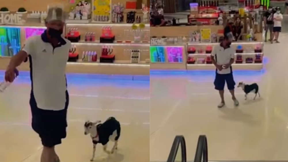 वीडियो में देखा जा सकता है कि बकरी जिसने कपड़े और डायपर पहने हुए हैं वो बड़े आराम से शॉपिंग मॉल के अंदर टहल रही है। मालिक ने उसे पट्टे से बांध रखा है। जबकि एक कुत्ता उसे देखकर भौंक रहा है। हालांकि, शख्स उसे बिल्कुल एक पालतू जानवर की तरह घुमा रहा है। वीडियो में बकरी को एलिवेटर पर चढ़ता हुआ भी देखा जा सकता है।