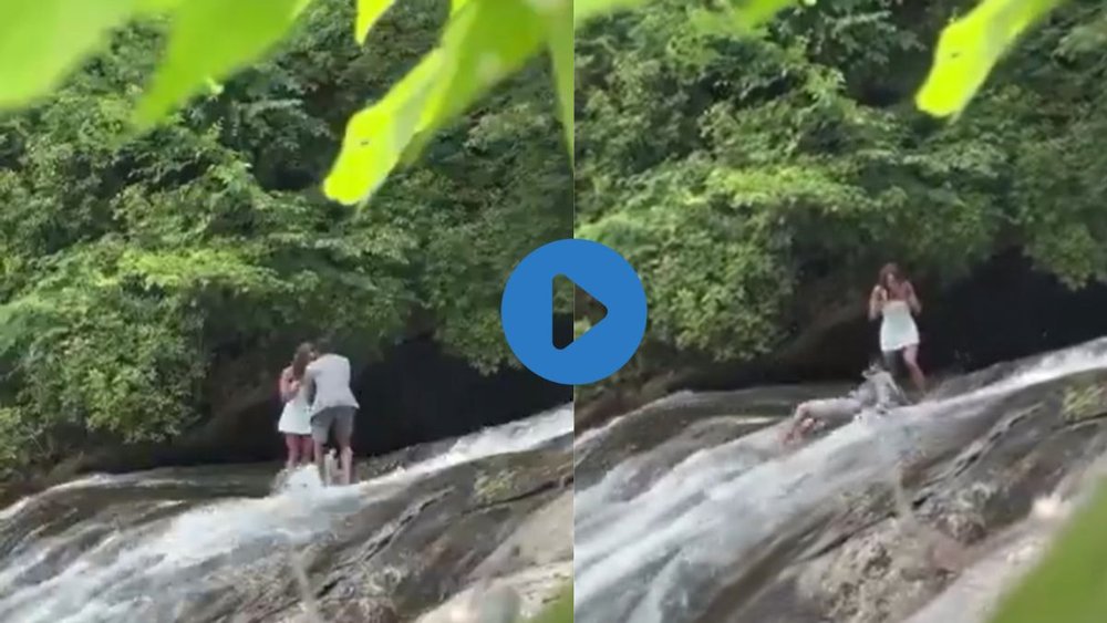 वीडियो में दिखाया गया है कि शख्स पहले प्रेमिका को अंगूठी दिखाते हुए प्रजोज करता है। जब लड़की उसे हां करती है तो वो बहुत खुशी से अंगूठी पहनाने के लिए घुटने पर बैठने की कोशिश करता है। हालांकि, वो पानी के बहाव के कारण फिसलन होने की वजह से चट्टान से फिसल जाता है और नीचे जा गिरता है। इस दौरान युवती हैरान नजर आती है।