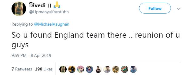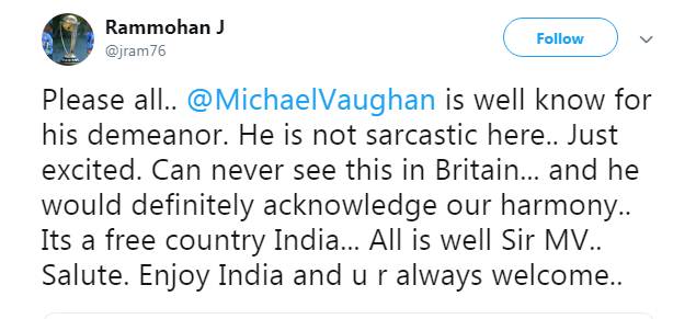 माइकल वॉन ने शायद हल्के-फुल्के अंदाज में यह ट्वीट किया, लेकिन भारतीय यूजर्स ने इस ट्वीट के लिए उन्हें आड़े हाथों ले लिया। भारतीय यूजर्स ने माइकल वॉन पर भारत और भारतीयों की बेइज्जती करने का आरोप लगाया। कुछ यूजर्स ने हालांकि माइकल वॉन की बात का समर्थन भी किया। बता दें कि माइकल वॉन भारत में यात्रा के दौरान ली गई तस्वीरों को भी अपने इंस्टाग्राम अकाउंट पर शेयर करते रहते हैं।