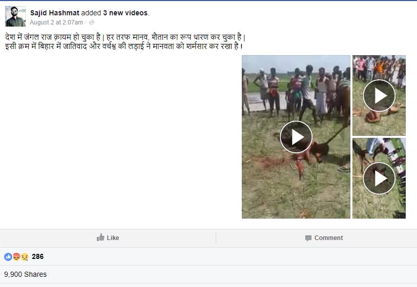 आपको बता दें कि इस वीडियो को बिहार का बताया जा रहा है लेकिन जनसत्ता.कॉम किसी भी हाल में इस वीडियो की पुष्टि नहीं करता है। इस वीडियो को लगभग 10 जार लोग अपने फेसबुक वॉल पर शेयर कर चुके हैं। इस वीडियो पर लोगों की प्रतिक्रियाएं भी आ रही हैं। यूजर्स लिख रहे हैं कि लगता है इंसानियत नाम की चीज़ इस दुनिया से खत्म हो चुकी है। वहीं कुछ यूजर्स लिख रहे हैं कि आज भीड़ किसी हैवान का रूप ले चुकी है।