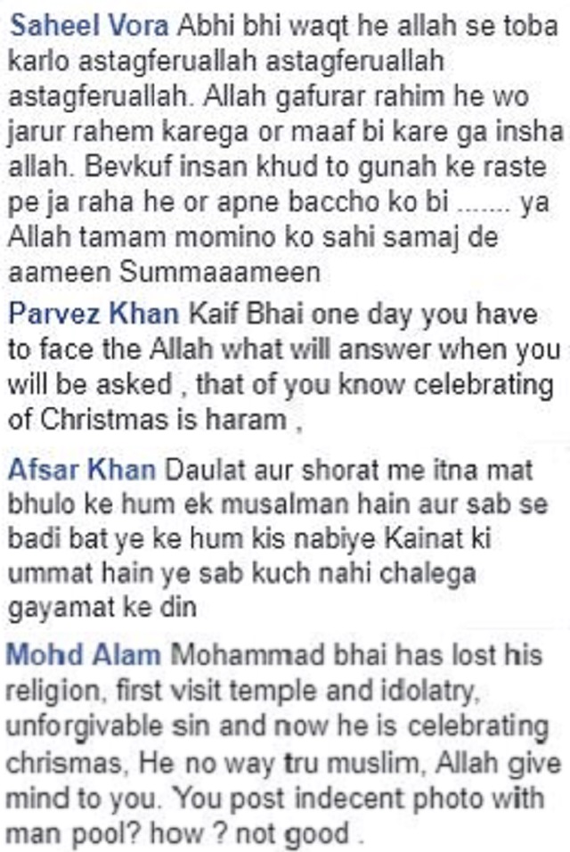 भारतीय क्रिकेट टीम के पूर्व क्रिकेटर मोहम्मद कैफ को एक बार फिर सोशल मीडिया में ट्रोल हो रहे हैं। इस बार मोहम्मद कैफ ने क्रिसमस की बधाई देते हुए अपने परिवार के साथ एक फोटो ऑफिशियल फेसबुक पेज और ट्विटर हैंडल शेयर की जिसे कई लोग इस्लाम के खिलाफ बताकर उनकी आलोचना कर रहे हैं। इस फोटो में कैफ अपनी पत्नी और दोनों बच्चों के साथ नजर आ रहे हैं और इसका कैप्शन उन्होंने दिया है मैरी क्रिसमस। कैफ ने जैसे ही यह फोटो पोस्ट की, लोगों ने उनकी आलोचना शुरु कर दी। रहीम शेख नाम के यूजर ने लिखा, ‘एक मुसलमान होके क्रिसमस मनाते हुए शर्म नहीं आती आपको….थोड़ा तो खुदा से खौफ खाओ कैफ भाई।’ वहीं, एक अन्य यूजर ने लिखा, ‘भाईजान मेरा दिल दुख गया ये पोस्ट देखकर, डिलीट करिए और ये त्यौहार हम मुसलमानों का नहीं है इसकी मुबारकबाद देना भी गुनाह है।’ फरहत अब्बास ने लिखा, ‘100000 लानत।’ हालांकि कई यूजर्स ने मोहम्मद कैफ को रिप्लाई करते हुए क्रिसमस की बधाईयां दी।