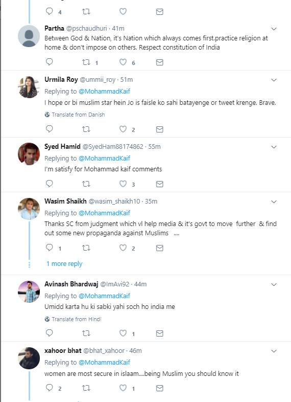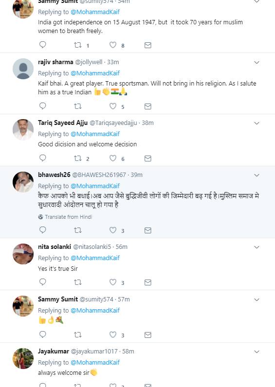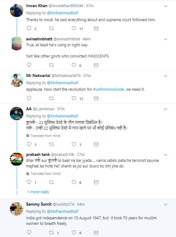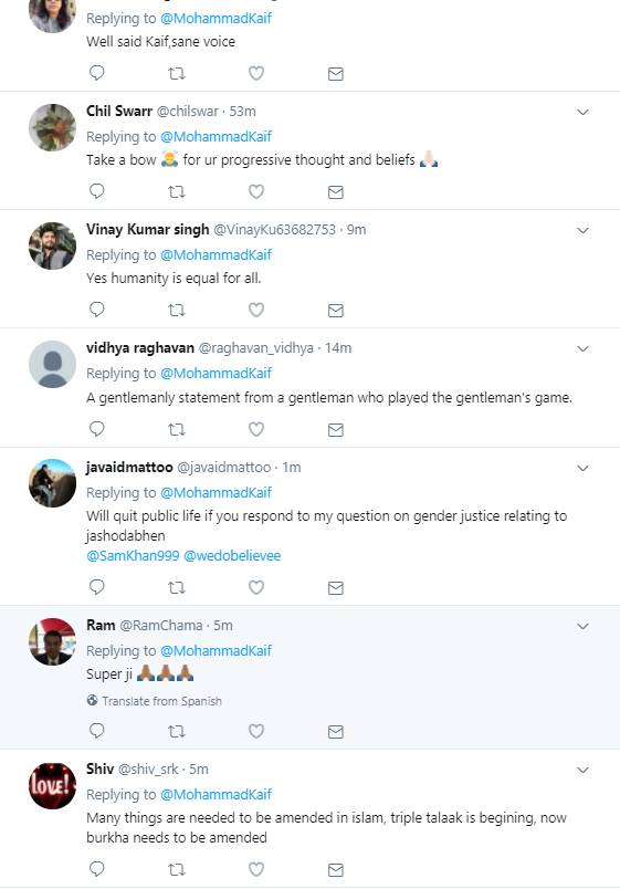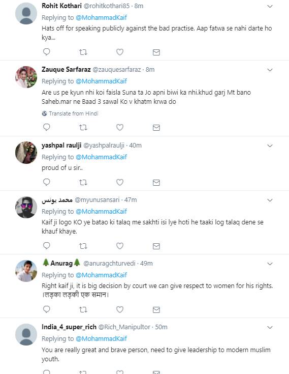 वहीं बहुत से यूजर्स ऐसे भी थे जो मोहम्मद कैफ के इस ट्वीट से इत्तेफाक नहीं रखते हैं। ऐसे यूजर्स मुस्लिम समुदाय के ही हैं। ये लोग कैफ को भलाबुरा कहते हुए लिख रहे हैं कि तुम किस आधार पर लैंगिक समानता की बात कर रहे हो। इन लोगों ने लिखा कि क्या तुम्हें पता नहीं है कि महिलाओं की भलाई के लिए ही तीन तलाक को बनाया गया था।