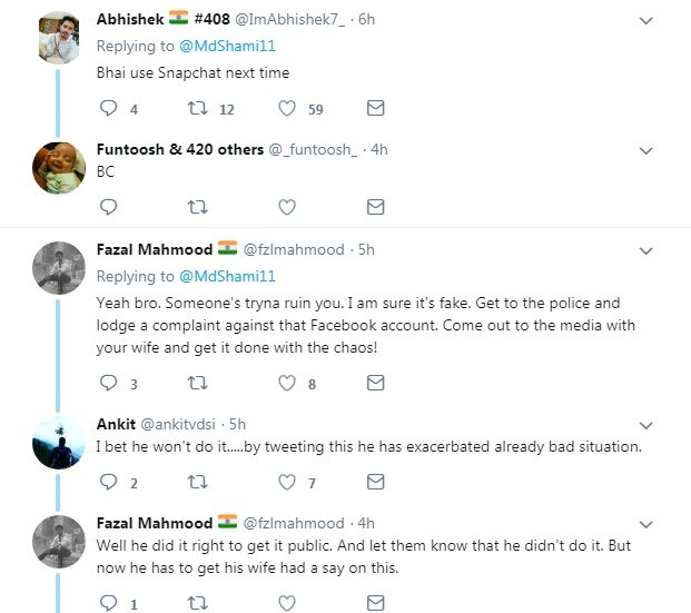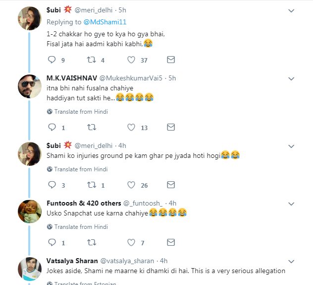 मोहम्मद शमी के इस सफाई के बाद लोगो उन्हें ट्रोल करने लगे। लोग लिख रहे हैं कि आपको शर्म आनी चाहिए इस तरह का काम करते हुए। ऐसे लोग लिख रहे हैं कि इतनी खूबसूरत पत्नी होते हुए गैर महिलाओं से संबंध बना कर आपने पाप किया है। बहुत से यूजर्स तो शमी की सफाई पर उनके मजे भी ले रहे हैं। ऐसे यूजर्स लिख रहे हैं कि भाई टेंशन ना लो..दो तीन अफेयर तो चलते ही हैं। वहीं बहुत से यूजर्स उन्हें व्हाट्सएप की जगह स्नैपचैट इस्तेमाल करने की सलाह दे रहे हैं।