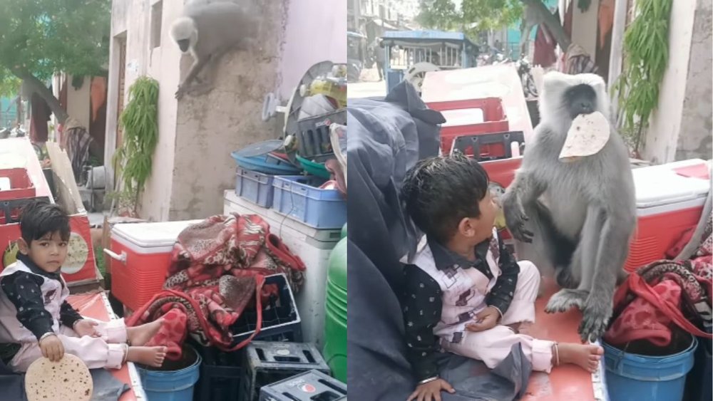 बच्चे के पास बैठकर रोटी खाने लगा लंगूर