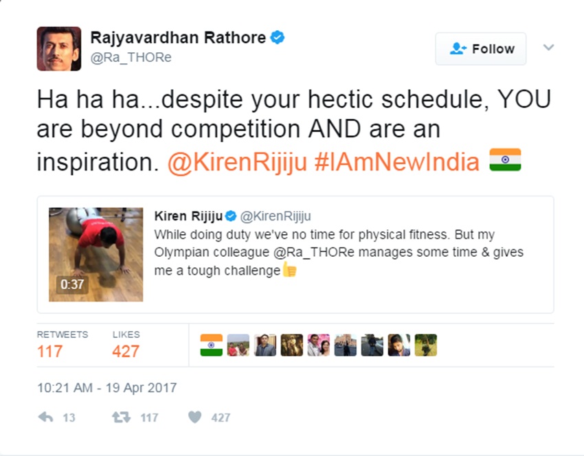 गृह राज्यमंत्री के इस ट्वीट के जवाब में मंत्री राज्यवर्धन ने ट्वीट किया कि आप अपने बिजी शेड्यूल के कारण भले कसरत के लिए उतना वक्त ना निकाल पाते हों लेकिन फिर भी आप किसी भी कंपिटिशन से परे हैं और एक इंसपीरेशन हैं।
