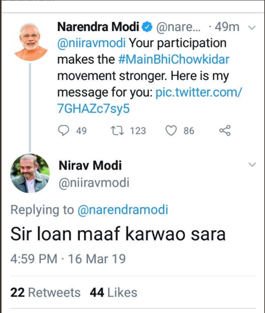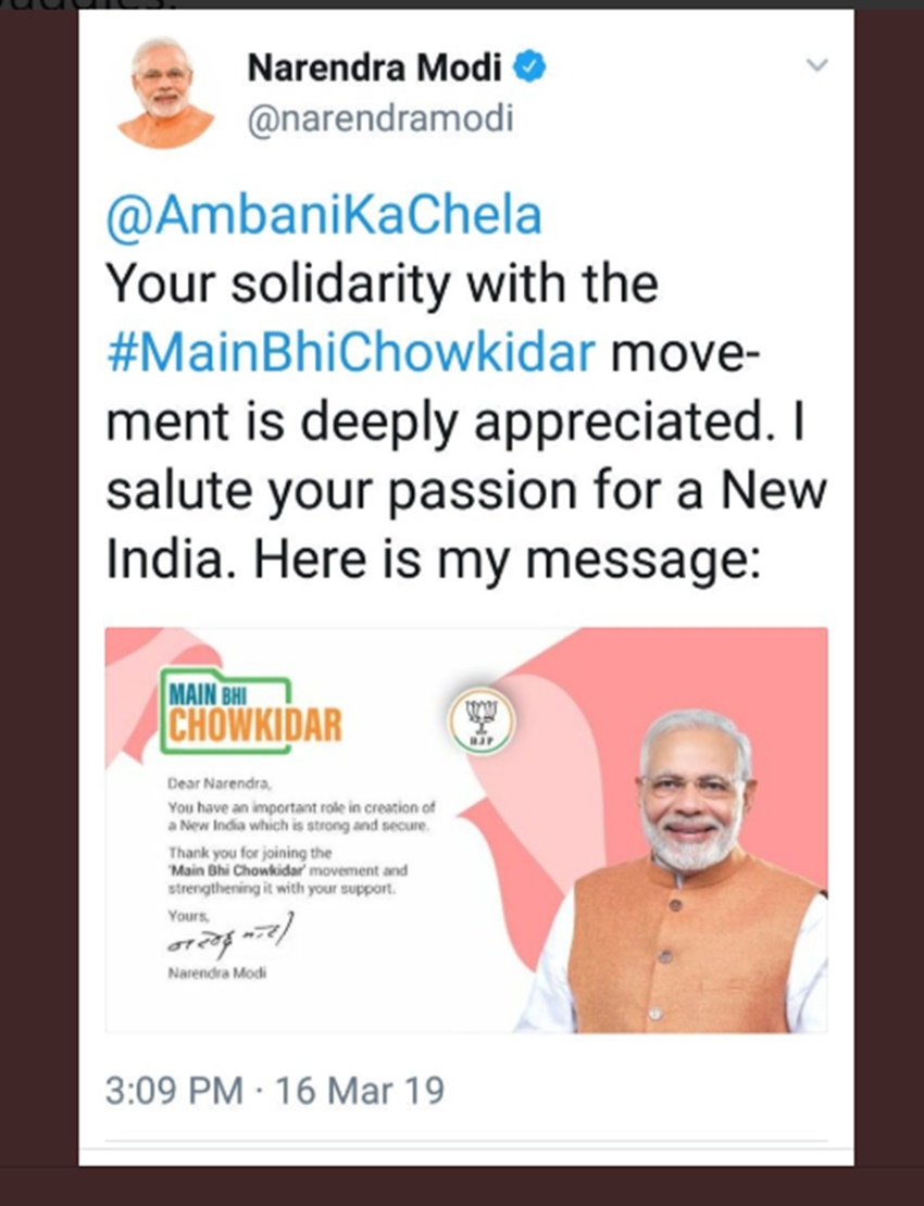 नरेंद्र मोदी के ट्विटर अकाउंट से ‘Nirav Modi Fan/@niiravmodi’ नामक ट्विटर हैंडल टैग हुआ ।जिसके बाद इस ट्विटर हैंडल को एक संदेश के साथ टैग किया गया। इसके बाद फिर गलती हुई जब Narendra Modi@AmbaniKaChela को टैग किया गया। इसके साथ ही इस ट्विटर हैंडल को मैं भी चौकीदार कैंपेन से जुड़ने के लिए धन्यवाद कहा गया।इसके बाद ध्रुव राठी और लालू प्रसाद यादव तक को ट्वीट में टैग किया गया। इस ट्वीट के बाद सोशल मीडिया पर बीजेपी की खिल्ली उड़ने लगी।ध्रुव राठी ने लिखा कि कुछ मूर्ख बीजेपी वालों को लगा कि ऑटो रिप्लाई से हैशटैग करने वालों को रिप्लाई जाएगा।लेकिन ये बुरी तरह फेल हो गया।