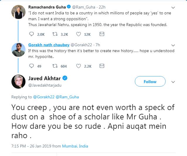 मशूहर कवि और हिंदी फिल्मों के गीतकार व पटकथा लेखक जावेद अख्तर एक बार फिर सोशल मीडिया में छाए हुए हैं। दरअसल शनिवार (26 जनवरी, 2019) को गणतंत्र दिवस के अवसर पर मशूहर इतिहासकार रामचंद्र गुहा ने ट्वीट किया। ट्वीट में उन्हें देश के पहले प्रधानमंत्री जवाहरलाल नेहरू की खूब तारीफ की। गुहा ने ट्वीट में लिखा, ”मैं नहीं चाहता कि भारत एक ऐसा देश हो, जिसमें लाखों लोग एक आदमी को ‘हां’ कहें। मुझे एक मजबूत विपक्ष चाहिए।” इस तरह, 1950 में जवाहरलाल नेहरू ने गणतंत्र की स्थापना की।” रामचंद्र गुहा के इस ट्वीट पर खुद को प्रधानमंत्री नरेंद्र मोदी का समर्थक बताने वाले सोशल मीडिया यूजर गोरख नाथ चौबे ने ट्वीट कर भारतीय इतिहास के ट्वीट पर कटाक्ष किया। ट्विटर यूजर्स चौबे ने ट्वीट कर लिखा, ‘अगर यह इतिहास होता तो नया इतिहास बनाना बेहतर होता। पाखंडी।’
