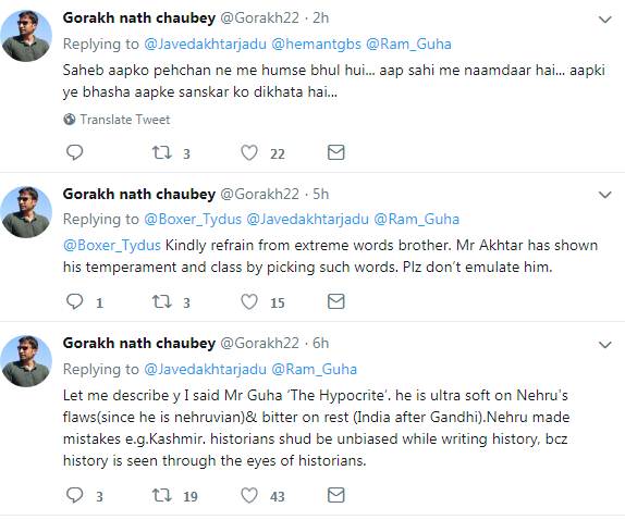 मोदी समर्थक ट्विटर यूजर के ट्वीट पर जावेद अख्तर खासे भड़क गए और उन्होंने चौबे के ट्वीट का जवाब देते हुए लिखा कि वह अपनी औकात में रहें। ट्वीट में अख्तर ने लिखा, ‘रेंगते कीड़े। तुम मिस्टर गुहा जैसे विद्वान के जूते पर धूल के एक टुकड़े बराबर भी नहीं हो। तुम्हारी इतनी हिम्मत कैसे हुई। अपनी औकात में रहो।’ ट्विटर प्रोफाइल पर खुद को ‘एक बार फिर से, मोदी दिल से’ बताने वाले गोरख नाथ ने भी अख्तर के ट्वीट का जवाब दिया। उन्होंने ट्वीट कर लिखा, ‘साहेब आपको पहचानने में हमसे बड़ी भूल हुई। आप सही में नामदार हैं। आपकी यह भाषा आपके संस्कार को दिखाती है।’
