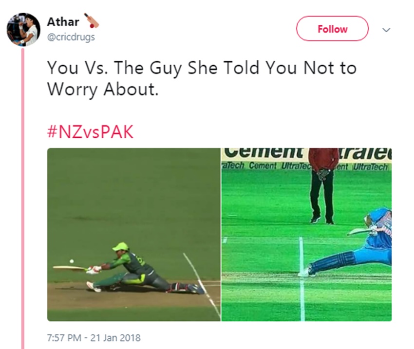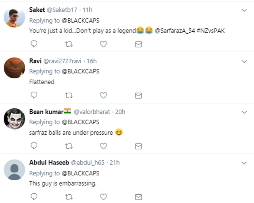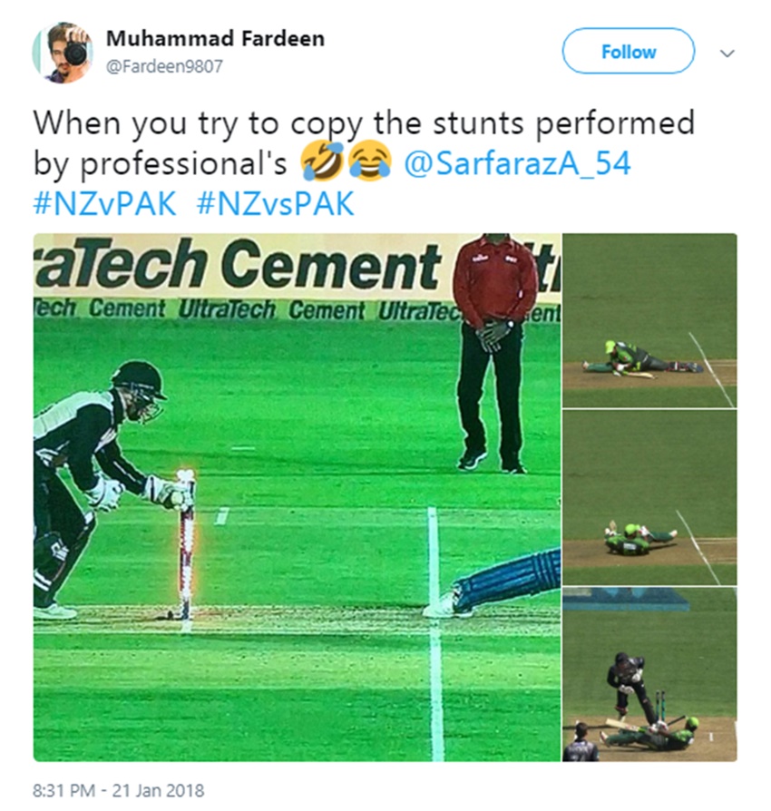 हुआ यूं था कि सरफराज अहमद पिच पर डटे थे। गेंदबाजी मिशेल सैंटनर कर रहे थे। पाकिस्तानी कप्तान ने उनकी गेंद को क्रीज के बाहर थोड़ा बढ़कर स्वीप करना चाहा, लेकिन इसी दौरान वह अपना संतुलन खो बैठे और गिर गए। वह अपने दोनों पैर विपरीत दिशा में फैला कर विकेट बचाना चाह रहे थे, मगर नाकामयाब रहे। पीछे खड़े विकेटकीपर ग्लेन फिलिप्स ने उन्हें स्टंप आउट कर दिया। सरफराज 14 गेंदों पर नौ रन कर इसके बाद पवेलियन लौट गए, जिसमें एक चौका भी शामिल था। देखिए उनके आउट होने पर कैसे मजे लिए।