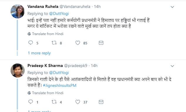ट्वीटर पर @Vandanaruhela ने लिखा कि, “भाई! इन्हें पता नहीं हमारे कर्मयोगी प्रधानमंत्री ने हिमालय पर हड्डियां भी गलाई हैं। मगर ये शॉर्टकट में भरोसा रखने वाले मूर्ख क्या जानें तप होता क्या है। @pradeepk9 ने लिखा कि, “जिनको गाली देने के ही पैसे आतंकवादियों से मिलते हैं वह प्रधानमंत्री क्या अपने बाप को भी दे सकते हैं। @chandan_khaoash ने लिखा कि, “ऐसा मत बोलिए जी, वरना आपको भी ये लिबर्ल लोग भक्त कहेंगे और मीम्स बनाएंगे। इससे पहले तो एक कवि ने अनपढ़ कहा था अब कुछ और कहेंगे।