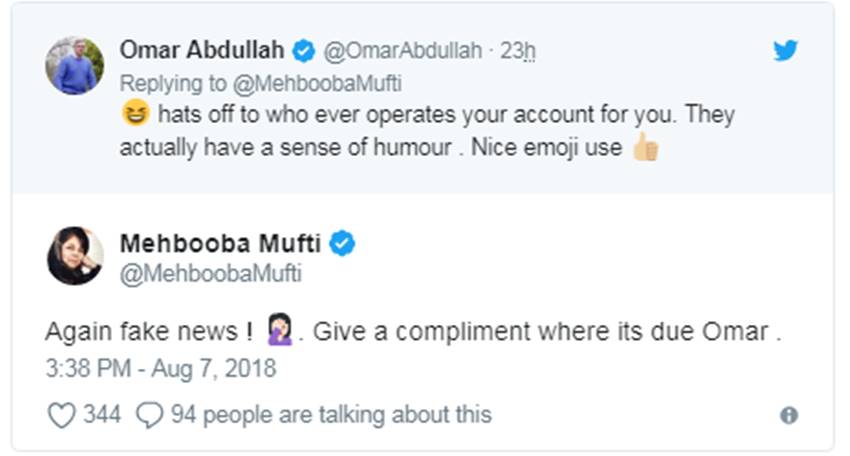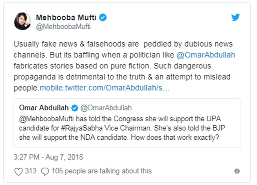 महबूबा ने इसी पर कहा, “फिर से फर्जी खबर! जहां पर चीजें बकाया हों, वहां पर कॉम्पलीमेंट दें उमर।” महबूबा ने इस ट्वीट के जरिए कहा कि सत्ता पक्ष और विपक्ष के उम्मीदवारों को उनके समर्थन देने के बयान की खबर गलत है। महबूबा बोलीं कि अबदुल्ला जैसे राजनेता जब कल्पना के आधार पर कहानी बुनते हैं, लोगों को ऐसे भ्रमित करने के प्रयास विफल हो जाते हैं। ऐसे दुष्प्रचार से सच को नुकसान पहुंचान पहुंचता है।