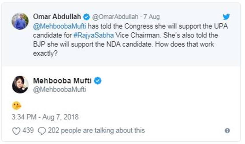 हुआ यूं कि मंगलवार (सात अगस्त) को अबदुल्ला ने दावा किया कि महबूबा ने भारतीय जनता पार्टी (बीजेपी) और कांग्रेस से यह वादा किया था कि राज्यसभा में उपसभापति के पद पर खड़े होने वाले उनके (दोनों पार्टियों) उम्मीदवारों को समर्थन देंगी। एनसी नेता ने इसी पर प्रश्न दागा, “क्या ऐसा वाकई में होगा?”