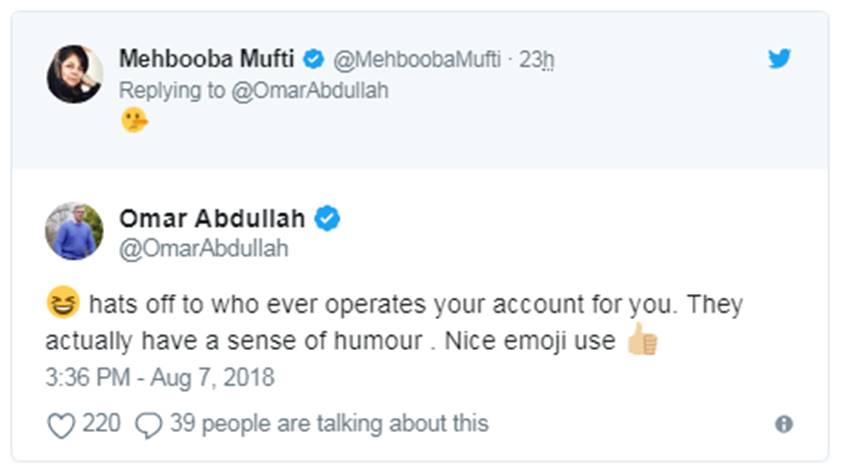 पीडीपी प्रमुख ने इसके बाद दिए जवाब में पिनोकियो का इमोजी इस्तेमाल किया। बता दें कि पिनोकियो कार्लो कोलोदी के उपन्यास का जाना माना किरदार था, जिसकी नाक का आकार झूठ बोलने पर बार-बार बढ़ जाता था। अबदुल्ला ने इसे मजाकिया लहजे में लिया और कहा, “जो भी आपका अकाउंट चलाता हो, उसे सलाम। क्या सेंस ऑफ ह्यूमर है। अच्छा ईमोजी इस्तेमाल किया।”