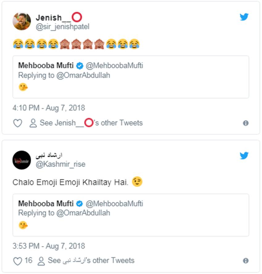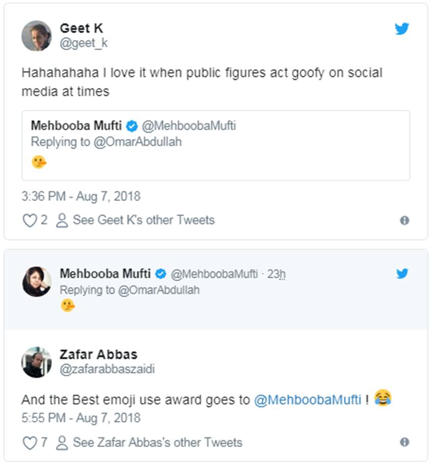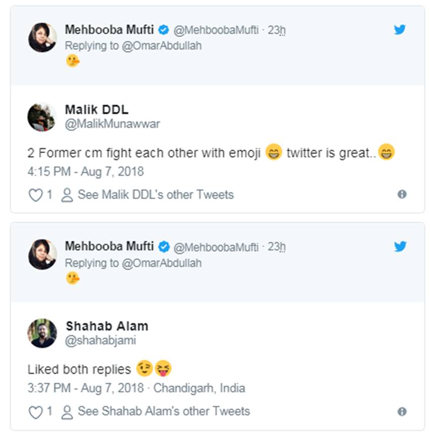 जम्मू-कश्मीर की पूर्व मुख्यमंत्री महबूबा मुफ्ती ने नेशनल कॉन्फ्रेंस (एनसी) के नेता उमर अबदुल्ला पर निशाना साधा है। उन्होंने इसके लिए अबदुल्ला के खिलाफ सोशल मीडिया पर एक खास इमोजी का इस्तेमाल किया। महबूबा के उस इमोजी पर अबदुल्ला इंप्रेस जरूर हुए, मगर वह असल बात का मतलब नहीं समझ सके कि आखिर क्यों वह खास इमोजी इस्तेमाल किया गया था। ऐसे में पूर्व सीएम ने अपना माथा पीट लिया, जबकि टि्वटर यूजर्स भी इस पूरे मसले पर इंप्रेस नजर आए।