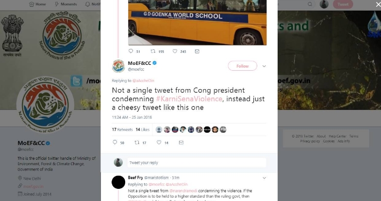 पर्यावरण एवं वन मंत्रालय का ट्विटर अकाउंट पद्मावत विवाद पर एक ट्वीट कर विवादों में फंस गया है। पर्यावरण एवं वन मंत्रालय के ट्विटर आधिकारिक ट्विटर अकाउंट से एक ट्वीट किया गया और लिखा गया, ‘करणी सेना के हिंसा की आलोचना करने के लिए कांग्रेस अध्यक्ष राहुल गांधी की ओर से एक भी ट्वीट नहीं किया गया।’ लेकिन केन्द्रीय मंत्री हर्षवर्धन के मंत्रालय से यहां एक चूक हो गई। पर्यावरण मंत्रालय द्वारा यह ट्वीट गुरुवार (25 जनवरी) को लगभग साढ़े ग्यारह बजे देर सुबह किया गया। जबकि राहुल गांधी 24 जनवरी को ही गुरुग्राम में करणी सेना की हिंसा की आलोचना कर चुके थे। वन एवं पर्यावरण मंत्रालय को जब इस गलती की जानकारी हुई तो उन्होंने अपने ट्विटर अकाउंट से इस ट्वीट को डिलीट कर दिया। हालांकि सोशल मीडिया पर लोगों ने इस ट्वीट के स्क्रीन शॉट को पहले ही रख लिया था। इस ट्वीट की वजह से मंत्रालय को आलोचना का शिकार होना पड़ रहा है।