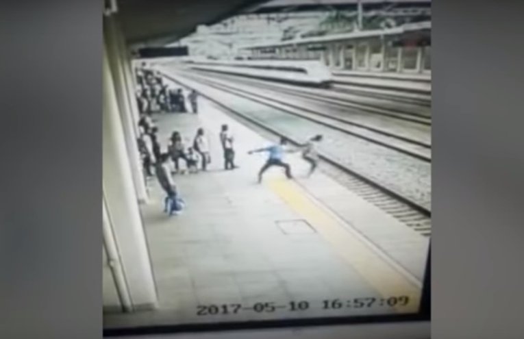 जैसे ही ट्रेन उसके पास वाले ट्रेक पर आती है वह उसके सामने कूदने के लिए भागती है।