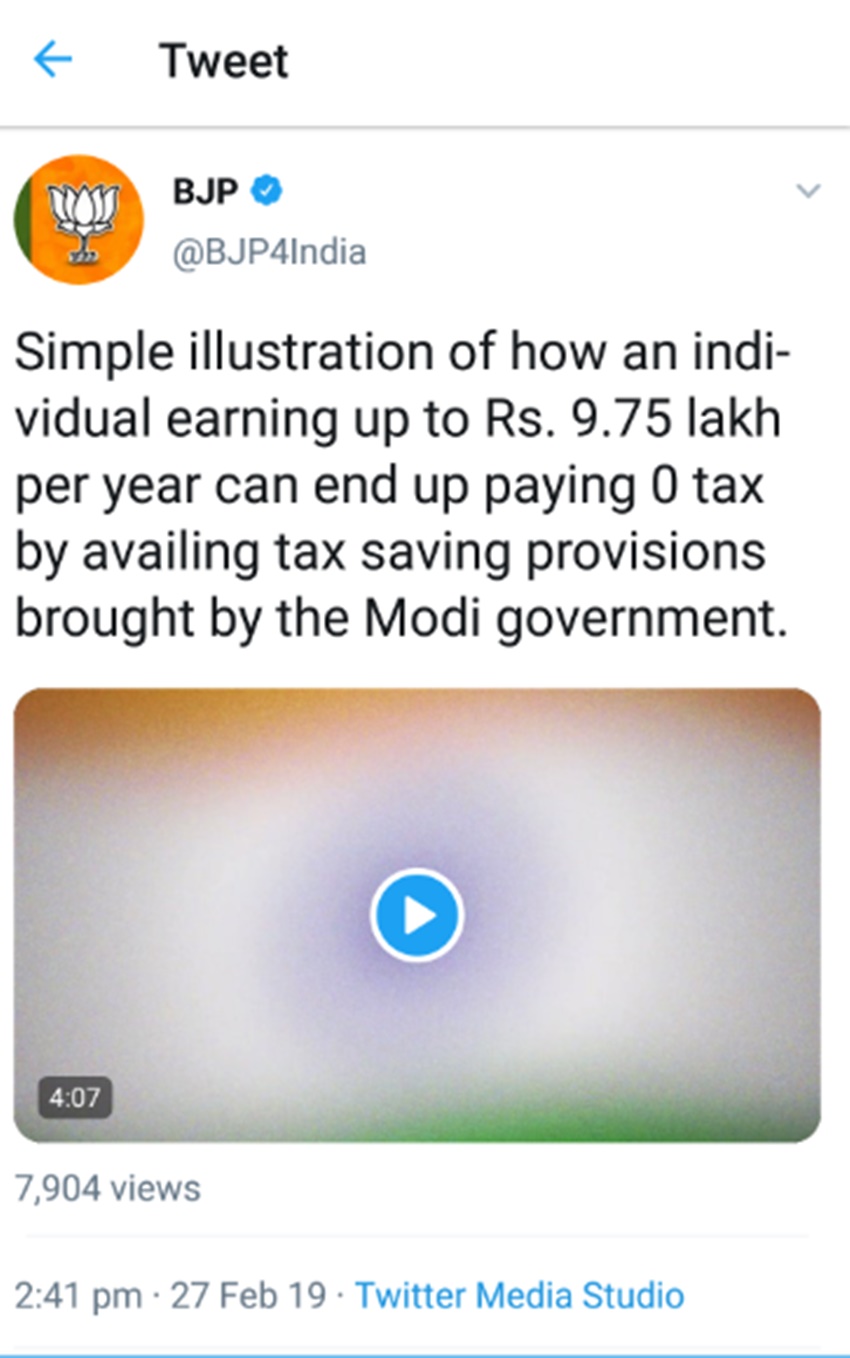 भारतीय वायुसेना ने 26 फरवरी मंगलवार को पाकिस्तान के बालाकोट में एयर स्ट्राइक करते हुए पाकिस्तान में घुसकर जैश ए मुहम्मद के कई ठिकानों को बर्बाद कर दिया। पुलवामा हमले की जवाबी कार्रवाई करते हुए भारत ने यह कदम उठाया। भारत की इस कार्रवाई के बाद से सुबह से ही तल्ख माहौल थे। भारत और पाकिस्तान दोनों तरफ आला कमान की बैठक हो रही था।इसके बाद पाकिस्तानी जेट्स ने बुधवार (27 फरवरी) को जम्मू-कश्मीर के राजौरी जिले के नौशेरा सेक्टर में भारतीय हवाई क्षेत्र का उल्लंघन किया लेकिन भारतीय विमानों ने उन्हें पीछे खदेड़ दिया।सीमा के पर बढ़ती तल्खियां के दौरान भारतीय जनता पार्टी के ट्विटर हैंडल से पार्टी गुणगान और उनके द्वारा किए गए काम का बखान करते हुए ट्वीट किया गया है।बीजेपी के ट्विटर हैंडल से लिखा गया है कि 9.75 सलाना कमाने वाले को भी टैक्स नहीं देना पड़ रहा है यह मोदी सरकार की ने किया है।
