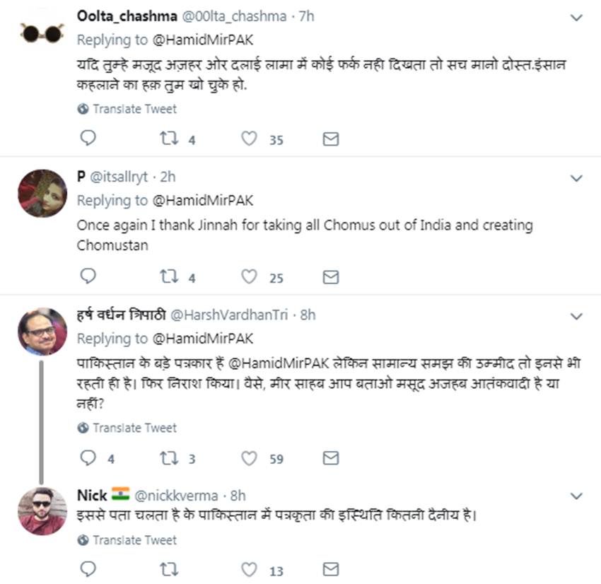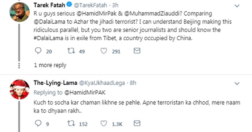 पाकिस्तानी टेलीविजन पत्रकार हामिद मीर गुरुवार (14 मार्च, 2019) को सोशल मीडिया पर बुरी तरह ट्रोल कर दिए गए। उन्होंने जैश-ए-मोहम्मद के सरगना मसूद अजहर से तिब्बत के सबसे बड़े धर्म गुरु दलाई लामा की तुलना कराई दी, जो कि दुनिया भर में शांति का संदेश फैलाने को लेकर जाने जाते हैं। लोगों ने इसी पर मीर की क्लास लगा दी और बोले कि लिखने से पहले कुछ तो सोच लिया करिए। अपने (पाक के) आतंकवाद को छोड़िए, कम से कम मेरे नाम (लामा) का तो ख्याल रख लें। हमें लगता है कि केवल बेवकूफ लोग ही इन दोनों के बीच की तुलना कर सकते हैं।