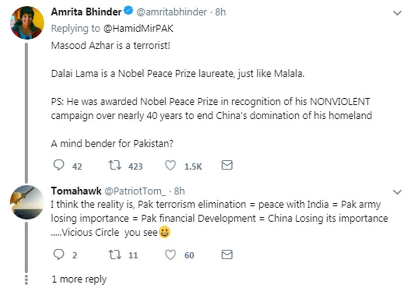 पाकिस्तानी पत्रकार ने इसी को लेकर ‘द सिडनी मॉर्निंग हेराल्ड’ की खबर साझा की थी। अखबार की उस रिपोर्ट में चीन के हवाले से दलाई लामा को आतंकवादी कहा गया था। बुधवार को मीर ने इसके साथ लिखा था, “यह समझना बेहद आसान है कि चीन ने संयुक्त राष्ट्र सुरक्षा परिषद (यूएनएससी) में मसूद अजहर पर प्रतिबंध लगाने का बचाव क्यों किया।” भारत चीन के दुश्मन को दशकों से शरण दिए हुए है और उसका नाम दलाई लामा है।”