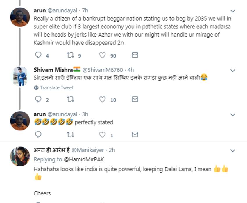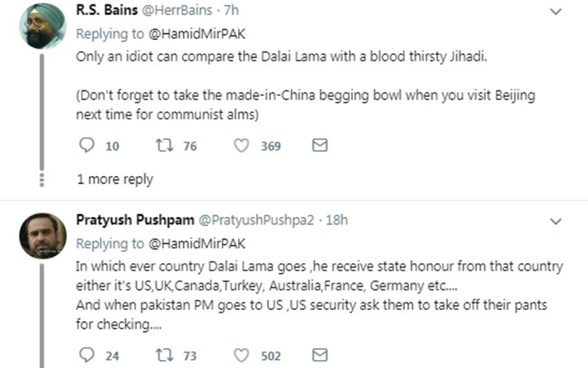 वहीं, कुछ यूजर्स ने मजे लेते हुए मीर को खरी-खोटी सुनाई। ऐसे लोगों ने ट्वीट्स में लिखा- दलाई लामा जहां भी जाते हैं, उनका वहां सम्मान होता है। वह नोबेल शांति पुरस्कार विजेता भी हैं, मगर जब भी पाकिस्तानी पीएम अमेरिका और ब्रिटेन सरीखे देश जाते हैं, तब उनके कपड़े तक उतरवा कर चेकिंग की जाती है।