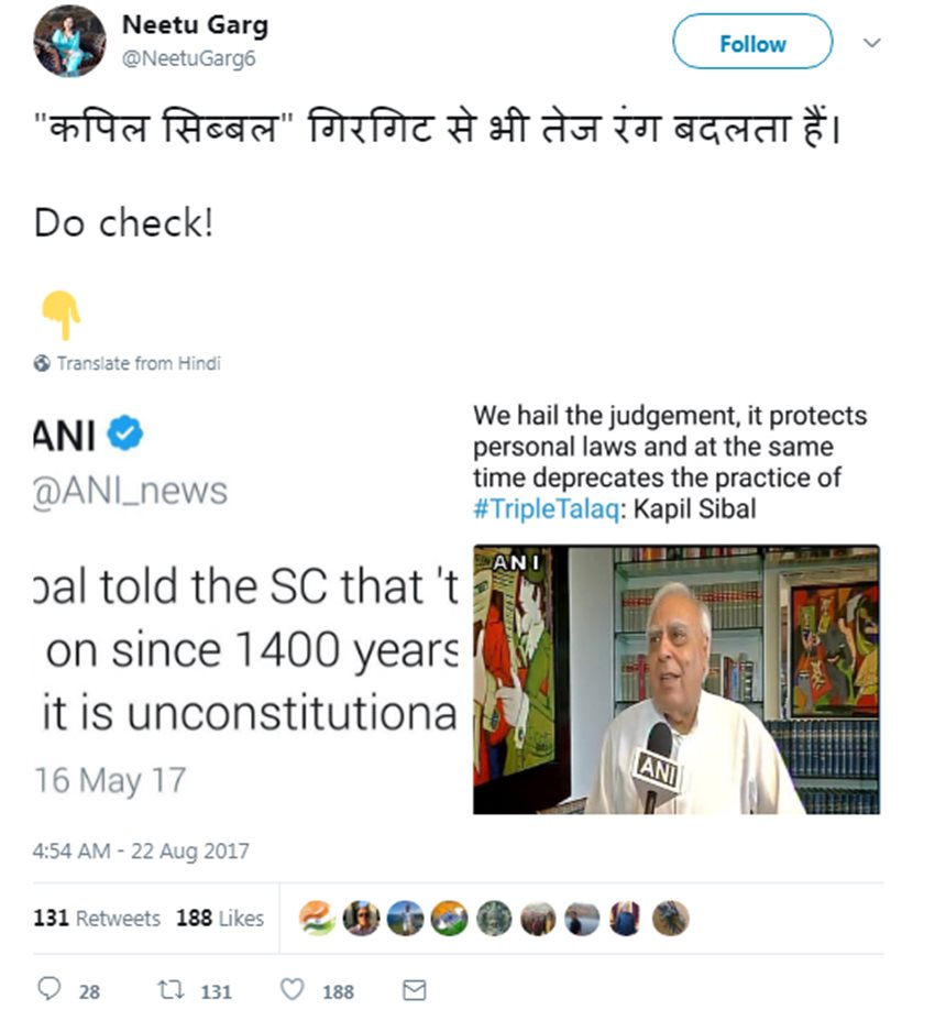 एक तस्वीर में उनके बीते मई महीने में सुप्रीम कोर्ट में दिया गया बयान है। सिब्बल ने तब कोर्ट में तीन तलाक पर बैन लगाने की खिलाफत की थी। उन्होंने कोर्ट में कहा था, “तीन तलाक बीते 1400 सालों से चला आ रहा है, इसे असंवैधानिक कैसे करार दिया जा सकता है?” वहीं, मगंलवार (22 अगस्त) को सुप्रीम कोर्ट के तीन तलाक पर बैन लगाने के बाद सिब्बल ने इस फैसले की तारीफ की थी। सिब्बल ने कहा, “हम सुप्रीम कोर्ट के फैसले का स्वागत करते हैं। यह पर्सनल लॉ को भी बचाता है और तीन तलाक को भी खारिज करता है।”