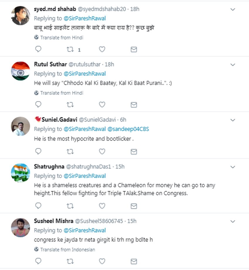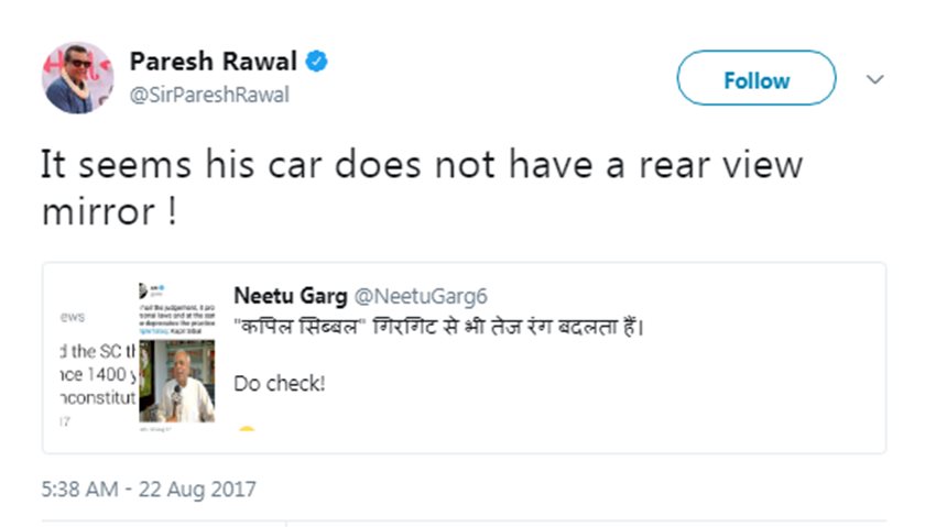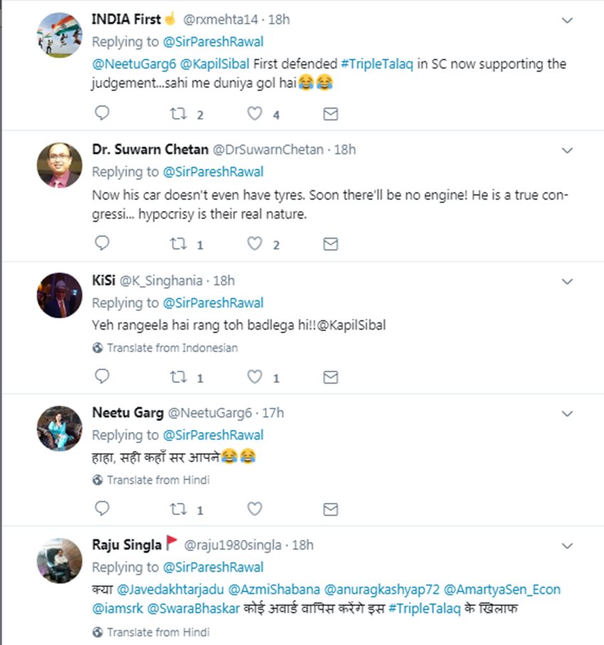अभिनेता और बीजेपी सांसद परेश रावल एक बार फिर से सुर्खियों में हैं। इस बार उन्होंने कांग्रेस नेता कपिल सिब्बल पर एक ट्विटर यूजर द्वारा शेयर की गई तस्वीरों पर चुटकी ली है और सोशल से उन्हें खूब सपोर्ट भी मिला है। परेश रावल के ट्विट पर कई ट्विटर यूजर्स ने जमकर कांग्रेस और कपिल सिब्बल को लताड़ा है। दरअसल कपिल सिब्बल को एक ही मुद्दे पर उनके दो बयानों के लिए ट्रोल किया गया है। सुप्रीम कोर्ट ने 6 महीने के लिए तीन तलाक पर बैन लगा दिया है। तीन तलाक का मुद्दा हाल ही में काफी चर्चा में रहा। इस मुद्दे पर नीतू गर्ग (@NeetuGarg6) नाम की एक ट्विटर यूजर ने सिब्बल के दो बयानों की तस्वीर शेयर की।