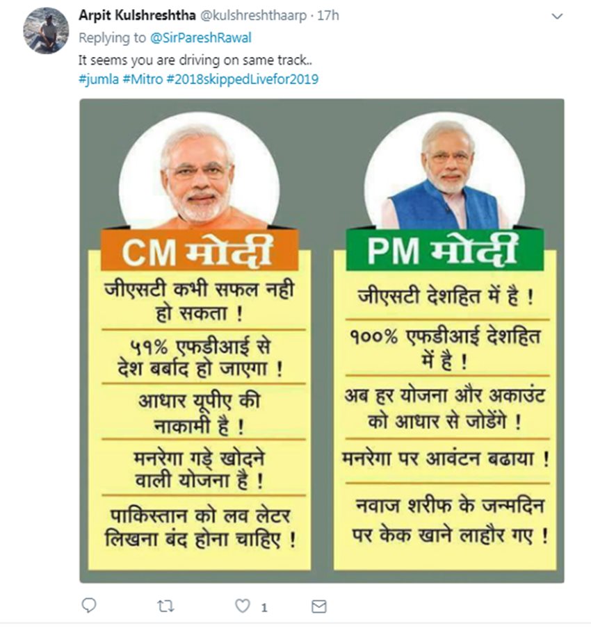 सिब्बल के इन दो बयानों की तस्वीर नीतू गर्ग ने ट्वीट की और फिर लोग सिब्बल पर टूट पड़े। गर्ग ने तस्वीर को कैप्शन देते हुए लिखा, “कपिल सिब्बल गिरगिट से भी तेज रंग बदलता हैं।” इसी पोस्ट को री शेयर करते हुए परेश रावल ने लिखा, “It seems his car does not have a rear view mirror!” इसके बाद फैन्स ने ट्रोल्स शुरू कर दिए। वहीं कुछ ट्विटर यूजर्स ने पीएम मोदी पर भी निशाना साधा। एक यूजर ने पीएम के दो बयानों की एक लिस्ट ट्वीट की। वहीं किुछ बीजेपी की आलोचना की।