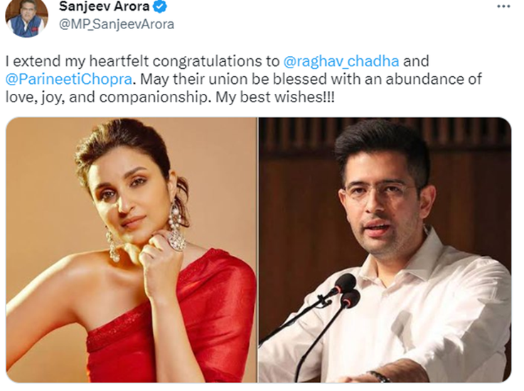 दरअसल, आम आदमी पार्टी के ही राज्यसभा सांसद और राघव चड्ढा के साथी संजीव अरोड़ा ने दोनों को बधाई दी है। संजीव अरोड़ा ने ट्वीट करते हुए लिखा-मैं राघव चड्ढा और परिणीति चोपड़ा को बहुत बधाई देता हूं। भगवान करे उनका साथ और प्यार यूं ही बना रहे। आप सांसद ने अपने इस ट्वीट में राघव चड्ढा और परिणीति चोपड़ा को टैग भी किया है। संजीव अरोड़ा के इस ट्वीट के बाद सोशल मीडिया यूजर्स सवाल पूछ रहे हैं कि क्या राघव और परिणीति ने शादी कर ली है।
