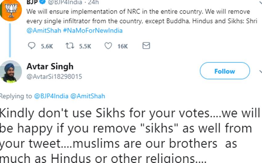 Bharatiya Janata Party President Amit Shah: भारतीय जनता पार्टी (बीजेपी) के राष्ट्रीय अध्यक्ष अमित शाह ने गुरुवार को एक रैली को संबोधित करते हुए कुछ ऐसा कहा जिससे कुछ लोग सहमत नजर नहीं आ रहे हैं। एनआरसी को लेकर दिए गए इस बयान में अमित शाह द्वारा कहा गया कि इस देश से हिंदुओं, सिखों और बौद्ध को छोड़ सारे घुसपैठियों को खदेड़ कर बाहर कर दिया जाएगा। अमित शाह के इस बयान पर सोशल मीडिया पर एक सरदार का दिया गया जवाब तेजी के साथ वायरल हो रहा है। सरदार ने अमित शाह को जवाब देते हुए लिखा, ‘वोट हासिल करने के लिए कृप्या सिखों के नाम का इस्तेमाल न करें। अगर आप अपने ट्वीट से सिखों का नाम हटा देंगे तो हमें बेहद खुशी होगी। मुस्लिम हमारे उतने ही करीब हैं जितने की हिंदू या कोई और धर्म। हम सभी भाई है’। सरदार के इस जवाब को सोशल मीडिया पर लोगों द्वारा बेहद पसंद किया जा रहा है। सरदार के अलावा बॉलीवुड एक्ट्रेस स्वरा भास्कर ने भी अमित शाह के इस बयान को लेकर सवाल उठाया है।