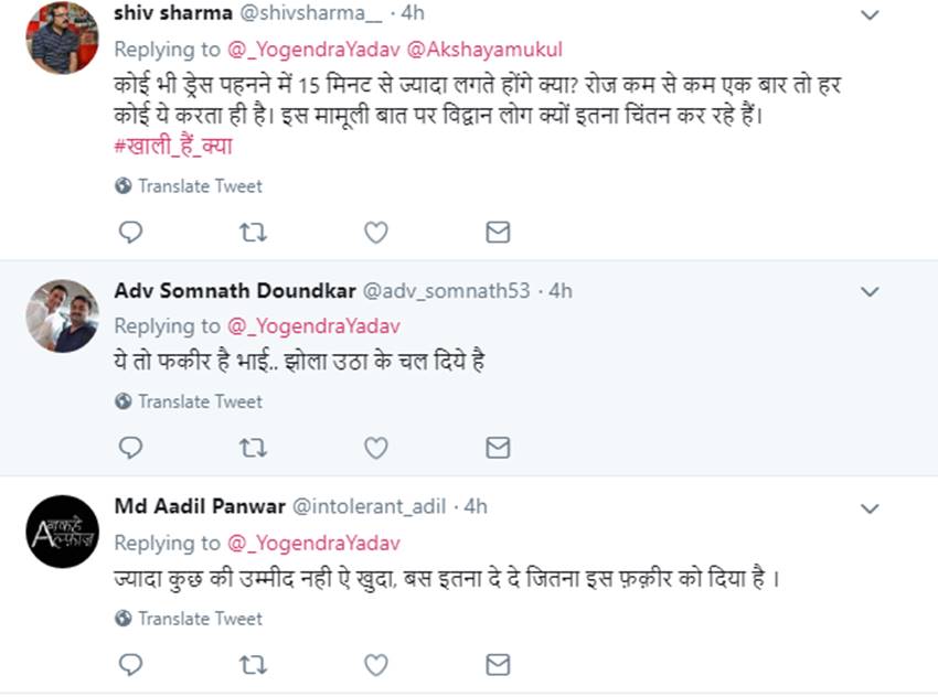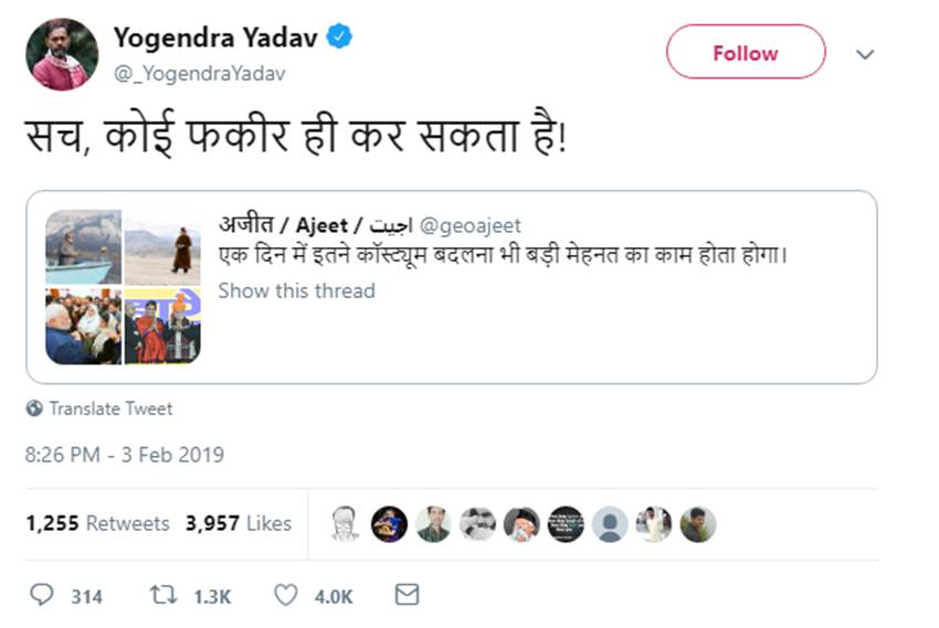 हालांकि योगेंद्र यादव के इस ट्वीट के बाद कई लोगों ने उन्हें भी ट्रोल करने किया है। बहरहाल आपको बता दें कि पीएम नरेंद्र मोदी अक्सर जब किसी राज्य में रैली करते हैं तो उनकी पहली पसंद स्थानीय वेश-भूषा ही होती है। स्थानीय लोगों से जुड़ने की उनकी यह कला हमेशा सुर्खियां बटोरती है। इससे पहले भी पीएम की एक ड्रेस काफी सुर्खियों में रही थी जब यह बात सामने आई थी कि पीएम के उस ड्रेस की कीमत लाखों रुपए में थी। राहुल गांधी पीएम मोदी और केंद्र की एनडीए सरकार को अक्सर शूट-बूट की सरकार कहकर उनपर तंज भी कसते हैं।