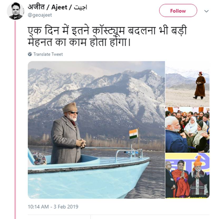 दरअसल पीएम ने कुछ ही दिनों पहले जम्मू-कश्मीर में एक रैली की थी। पीएम ने लद्दाख, जम्मू और श्रीनगर में ताबड़तोड़ रैली थी। इन तीन जगहों पर रैली के दौरान पीएम चार अलग-अलग कपड़ों में नजर आए। पीएम ने सभी जगह पर स्थानीय कपड़े पहने और स्थानीय भाषा में बातचीत भी की। लेकिन एक ही दिन में प्रधानमंत्री द्वारा 4 कपड़े बदले जाने को लेकर सोशल मीडिया पर खूब चर्चा हो रही है। कई लोग इसपर गंभीर प्रतिक्रिया दे रहे हैं तो कुछ लोग इसपर मजेदार रिएक्शन भी दे रहे हैं।