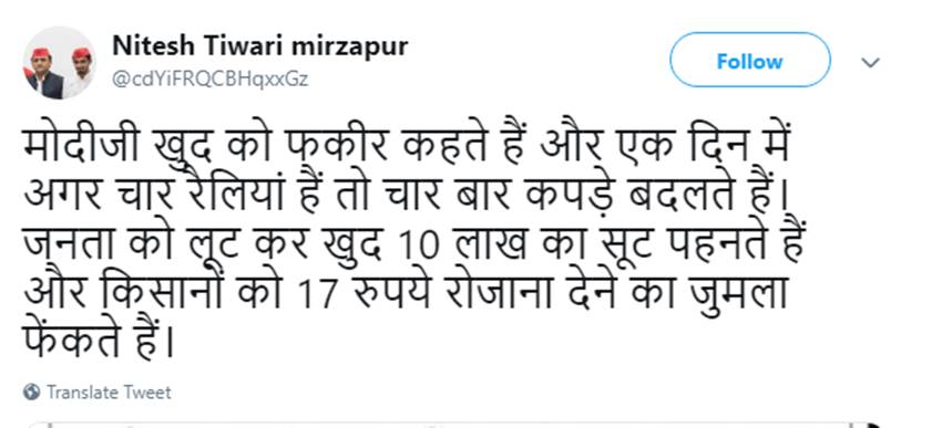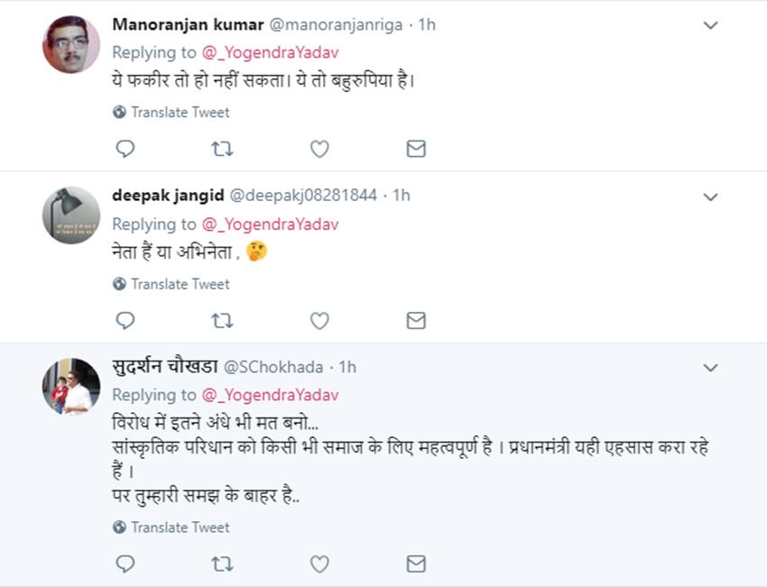 हालांकि योगेंद्र यादव के इस ट्वीट के बाद कई लोगों ने उन्हें भी ट्रोल करने किया है। बहरहाल आपको बता दें कि पीएम नरेंद्र मोदी अक्सर जब किसी राज्य में रैली करते हैं तो उनकी पहली पसंद स्थानीय वेश-भूषा ही होती है। स्थानीय लोगों से जुड़ने की उनकी यह कला हमेशा सुर्खियां बटोरती है। इससे पहले भी पीएम की एक ड्रेस काफी सुर्खियों में रही थी जब यह बात सामने आई थी कि पीएम के उस ड्रेस की कीमत लाखों रुपए में थी। राहुल गांधी पीएम मोदी और केंद्र की एनडीए सरकार को अक्सर शूट-बूट की सरकार कहकर उनपर तंज भी कसते हैं।