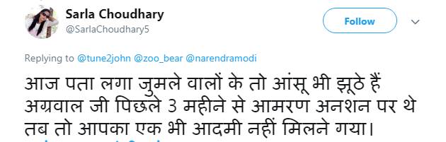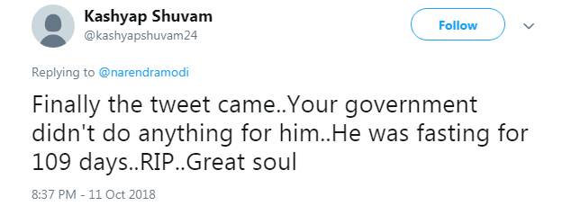 पीएम मोदी के ट्वीट पर एक यूजर ने लिखा कि याद करना बंद कीजिए और काम शुरु कीजिए। प्रोफेसर जीडी अग्रवाल गंगा के संरक्षण को लेकर गंगा प्रोटेक्शन मैनेजमेंट एक्ट का लागू करने और गंगा पर बन रहे सभी हाइड्रोइलेक्ट्रिक प्रोजेक्ट को बंद करने की मांग कर रहे थे। क्या आप उनकी यह इच्छा पूरी करेंगे? एक अन्य यूजर ने लिखा कि गंगा सफाई की आड़ में पिछले 70 सालों में हर रूलिंग पार्टी ने पैसा कमाया है। मां गंगा के पुत्र भी अपवाद नहीं हैं? अब भागीरथ नहीं होते बल्कि भागीरथ की आड़ में लुटेरे नेता ही आते हैं???