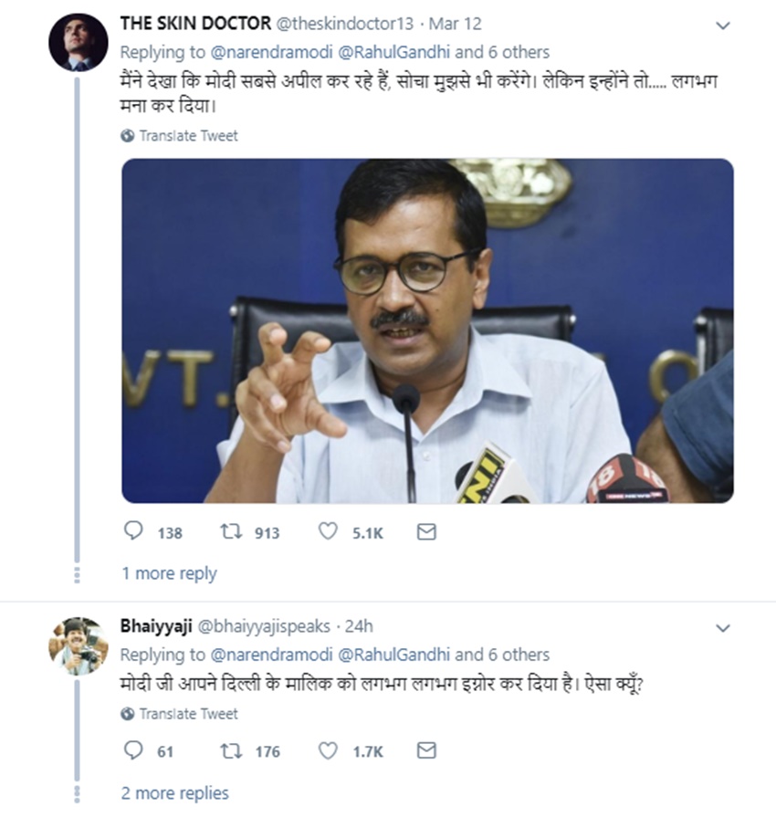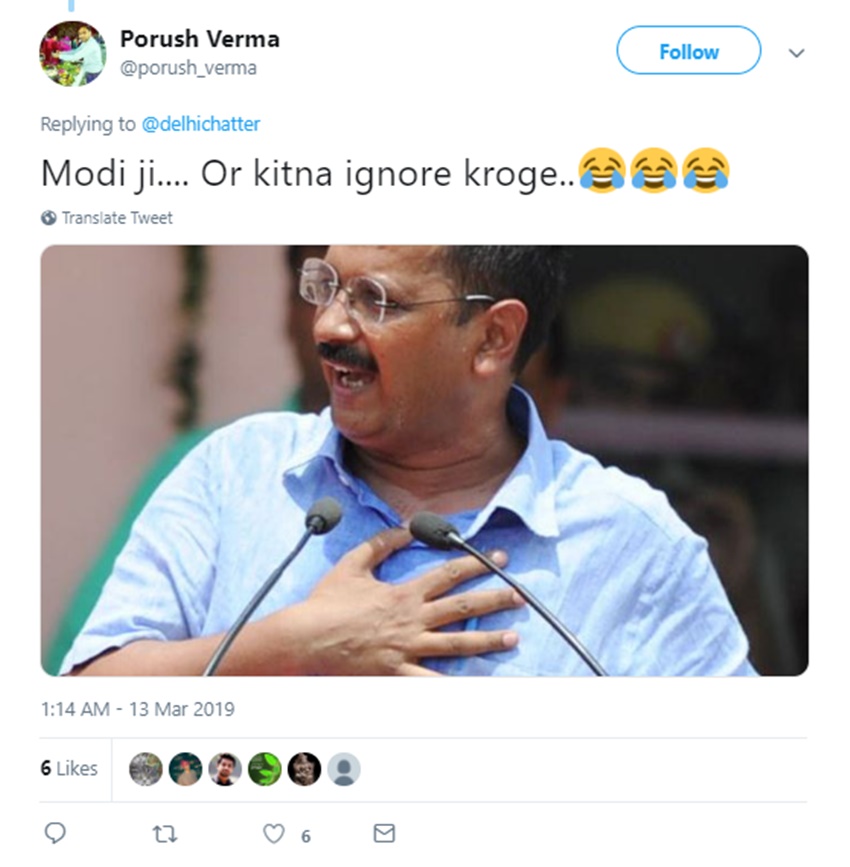 पीएम मोदी ने ट्विटर पर राहुल गांधी, मायावती, ममता बनर्जी, अखिलेश यादव समेत कई नेताओं को टैग किया। इस दौरान पीएम मोदी ने दिल्ली के सीएम अरविंद केजरीवाल को ट्वीट में टैग नहीं किया जिसके बाद सोशल मीडिया पर दिल्ली के सीएम अरविंद केजरीवाल को ट्रोलर्स ने ट्रोल कर दिया। अरविंद केजरीवाल को ट्रोल करते हुए एक शख्स ने सीएम अरविंद केजरीवाल की तस्वीर शेयर की है जिसमें वह अपने सीने पर हाथ लाए नजर आ रहे हैं। उनकी इस तस्वीर को शेयर करते हुए उसने लिखा है मोदी जी और कितना इग्नोर करोगे?
