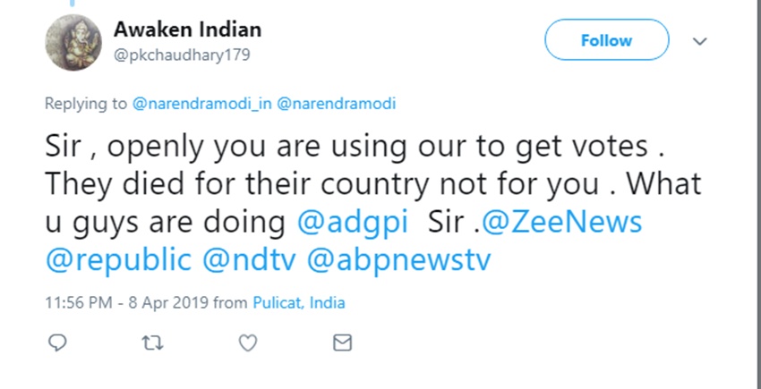 प्रधानमंत्री नरेंद्र मोदी के इस ट्वीट के बाद ट्विटर पर लोग उनकी खिंचाई करने लगे। कई लोगों ने पीएम की इस ट्वीट पर अपनी प्रतिक्रिया दी है। कुछ लोग तो पूछ रहे हैं कि ‘चुनाव आयोग कहां है?’ कुंवर पाल सिंह नाम के एक यूजर ने इसपर प्रतिक्रिया देते हुए लिखा कि ‘क्या भारतीय सेना चुनाव लड़ रही है। नौजवानों का पहला वोट होना चाहिए शिक्षा, स्वास्थ्य, रोजगार के लिए।’