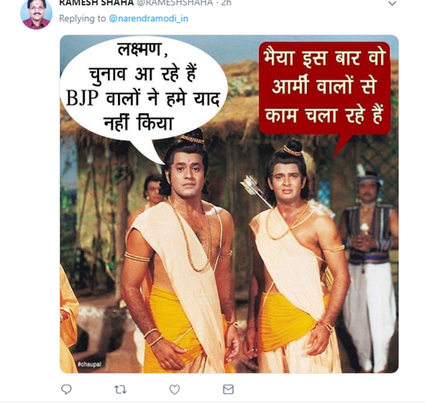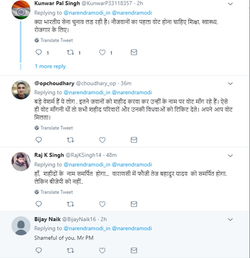प्रधानमंत्री नरेंद्र मोदी के इस ट्वीट के बाद ट्विटर पर लोग उनकी खिंचाई करने लगे। कई लोगों ने पीएम की इस ट्वीट पर अपनी प्रतिक्रिया दी है। कुछ लोग तो पूछ रहे हैं कि ‘चुनाव आयोग कहां है?’ कुंवर पाल सिंह नाम के एक यूजर ने इसपर प्रतिक्रिया देते हुए लिखा कि ‘क्या भारतीय सेना चुनाव लड़ रही है। नौजवानों का पहला वोट होना चाहिए शिक्षा, स्वास्थ्य, रोजगार के लिए।’