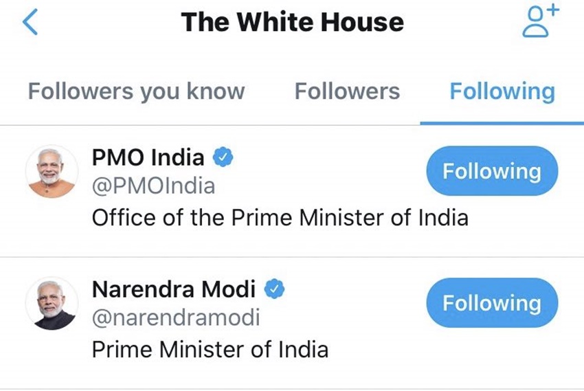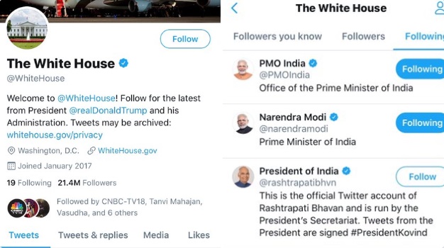 व्हाइट हाउस के करीब 21 मिलियन ट्विटर फॉलोअर्स हैं। लेकिन यह अकाउंट सिर्फ 19 लोगों को फॉलो करता है। 19 में से 16 अमेरिकी ट्विटर अकाउंट हैं। बाकी के तीनों भारत से संबंध रखते हैं। ये तीनों हैं- नरेंद्र मोदी का अकाउंट, प्रधानमंत्री कार्यालय का अकाउंट और राष्ट्रपति भवन का अकाउंट।
