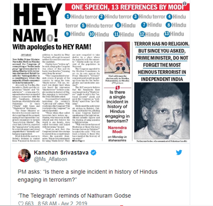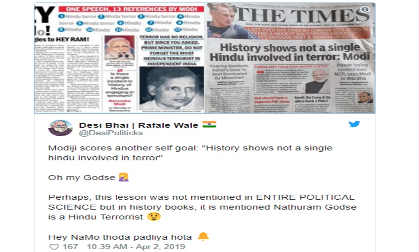 Mr Prime Minister – who was Nathuram Godse !! If not a terrorist !!! @narendramodi @RahulGandhi pic.twitter.com/LirBVKuXAl