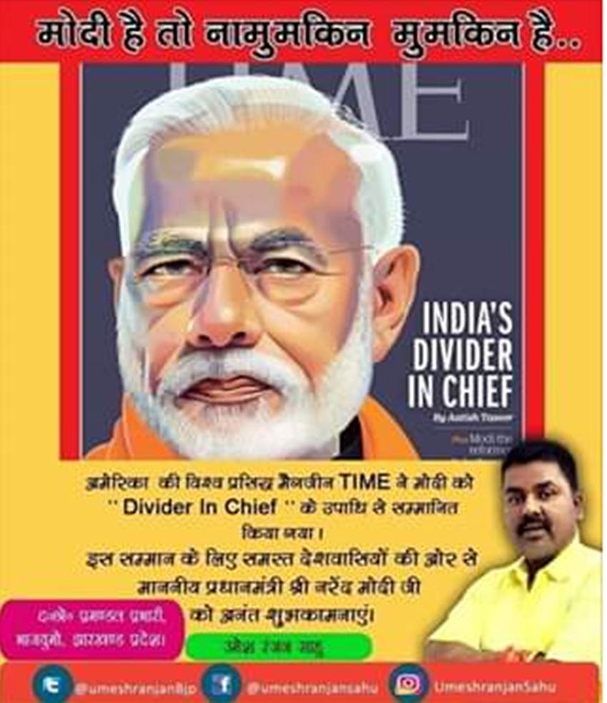 मशहूर पत्रिका ‘टाइम’ द्वारा अपने ताजा अन्तर्राष्ट्रीय संस्करण के कवर पर प्रधानमंत्री नरेंद्र मोदी की तस्वीर लगायी है। इस तस्वीर के साथ टाइम ने जो हेडलाइन दी है, वो है ‘इंडियाज डिवाइडर इन चीफ’। इसे लेकर भारत में सोशल मीडिया पर काफी कुछ लिखा जा रहा है। वहीं कुछ लोग ऐसे भी हैं, जो बिना इस हेडलाइन का मतलब समझे, इसे पीएम मोदी की एक उपलब्धि बता रहे हैं। दरअसल कुछ लोग ‘डिवाइडर इन चीफ’ को एक सम्मानित अन्तर्राष्ट्रीय उपाधि समझ रहे हैं। जिसके चलते उन्होंने सोशल मीडिया पर इसे लेकर बधाई संदेश देने शुरु कर दिए हैं। ऐसे ही कई सोशल मीडिया पोस्ट सामने आए हैं।
