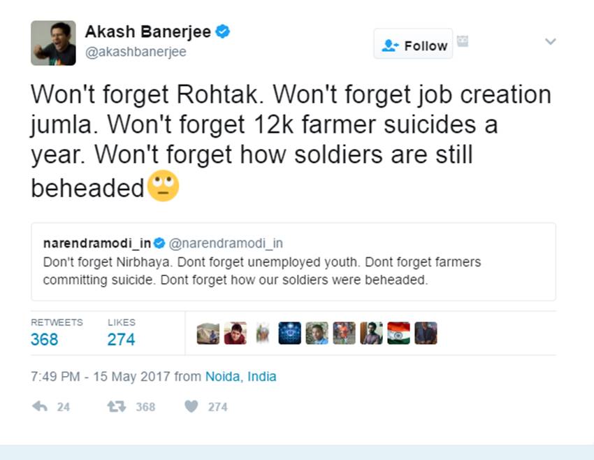 प्रधानमंत्री बनने से पहले नरेंद्र मोदी द्वारा किये गए इस ट्वीट को रिट्वीट करते हुए रेडियो मिर्ची के आरजे आकाश बैनर्जी ने लिखा – हम रोहतक को नहीं भूलेंगे, हम रोजगार वाले जुमले को नहीं भूलेंगे, हर साल 12 हजार किसानों की आत्महत्या को नहीं भूलेंगे, हम नहीं भूलेंगे कि कैसे आज भी हमारे सैनिकों के सिर काटे जा रहे हैं।