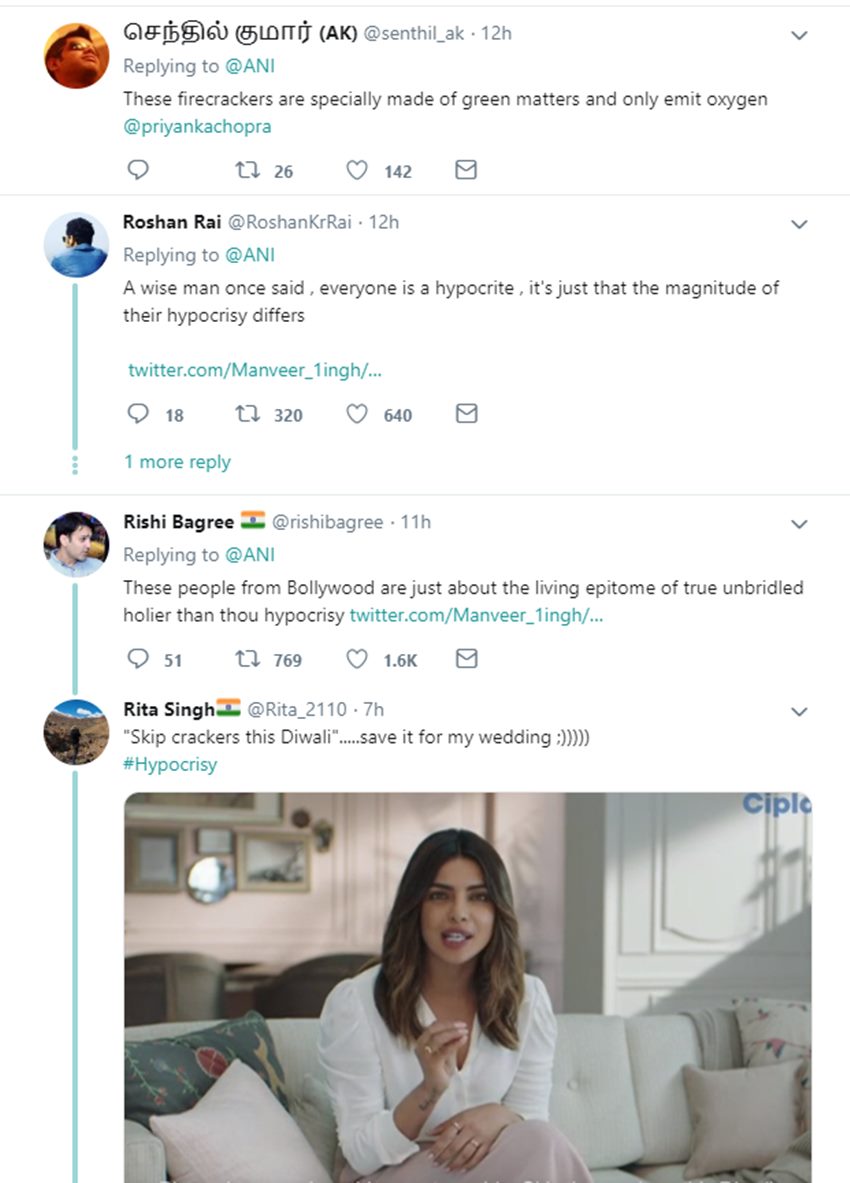 कई लोगों ने दीपावली पर पटाखे न जलाने की अपील करने वाले प्रियंका का वीडियो शेयर कर पूछा है कि वह खुद अपनी सलाह पर अमल क्यों नहीं कर रही हैं?