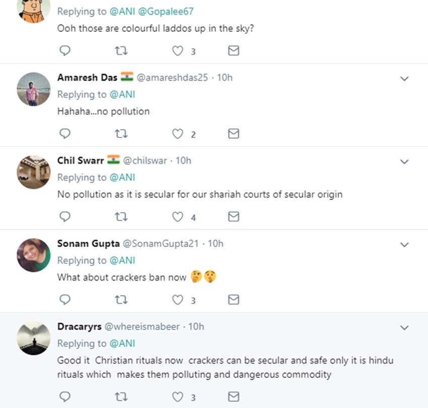 बहुत से लोगों ने इन पटाखों को ‘प्रदूषण-मुक्त’ बताते हुए पूरे प्रकरण पर चुटकी भी ली। देखें ट्विटर यूजर्स की प्रतिक्रियाएं: