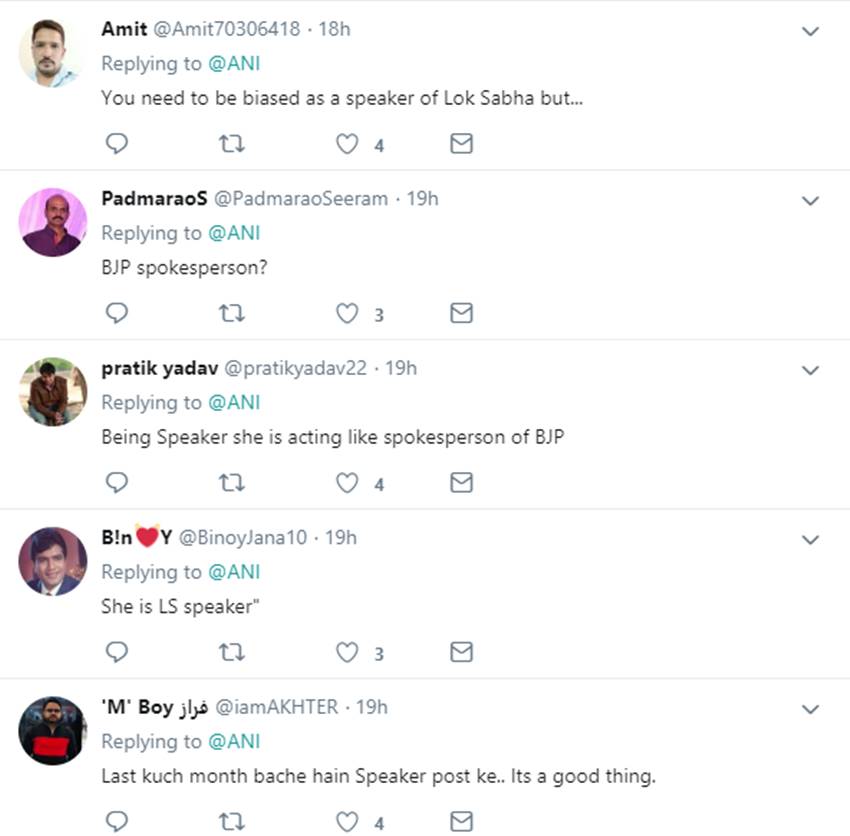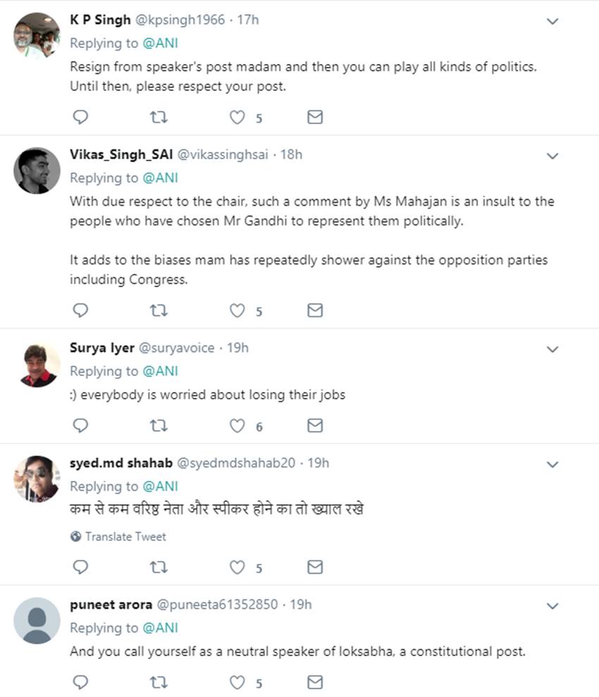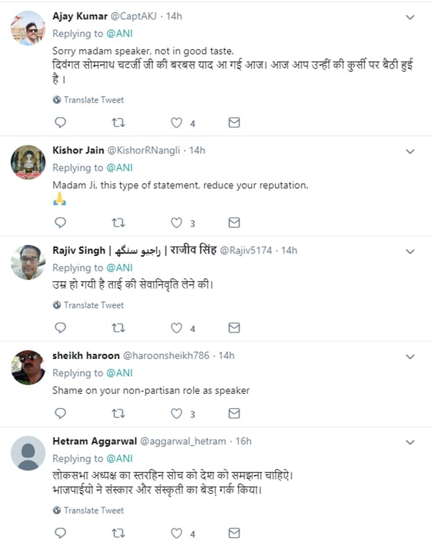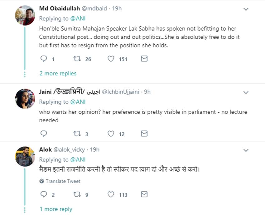 महाजन का यह बयान सोशल मीडिया पर कई यूजर्स को रास नहीं आया। कई लोगों ने एक संवैधानिक पद पर बैठे शख्स के इस तरह किसी पार्टी के फैसले को निशाना बनाने की आलोचना की। कवि व नेता डॉ कुमार विश्वास ने ट्विटर पर लिखा, “आदरणीया ताई! आप लोकसभा अध्यक्ष के “संवैधानिक पद” पर हैं।” एक अन्य यूजर आलोक ने कहा, “मैडम इतनी राजनीति करनी है तो स्पीकर पद त्याग दो और अच्छे से करो।” मोहम्मद शहाब ने कहा, “कम से कम वरिष्ठ नेता और स्पीकर होने का तो ख्याल रखें।”