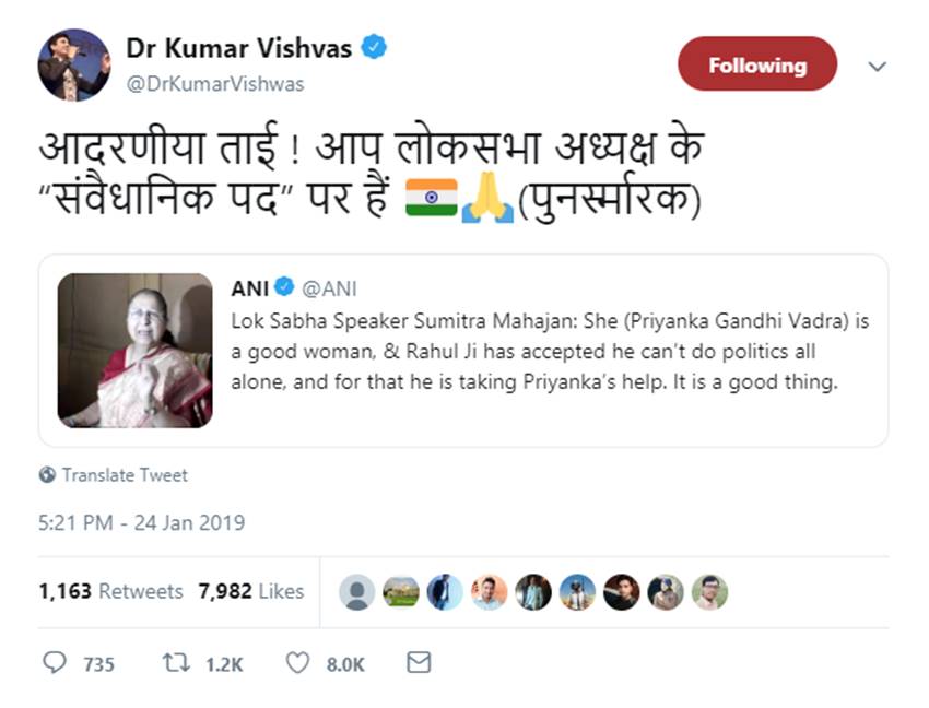सक्रिय राजनीति में प्रियंका गांधी वाड्रा की एंट्री पर लोकसभा अध्यक्ष सुमित्रा महाजन ने कांग्रेस अध्यक्ष राहुल गांधी की नेतृत्व क्षमता पर सवाल उठा दिए हैं। महाजन ने मीडिया से बातचीत में कहा, “प्रियंका अच्छी महिला हैं। मगर (पूर्वी उत्तरप्रदेश की प्रभारी कांग्रेस महासचिव के रूप में) उनकी नियुक्ति से यह बात भी सामने आती है कि राहुल ने एक प्रकार से स्वीकार कर लिया कि राजनीति करना उनके अकेले के बस की बात नहीं है।” उन्होंने कहा, “यह बहुत अच्छी बात है कि राहुल को समझ आ गया कि वह अकेले राजनीति नहीं कर सकते। इसलिये उन्होंने बहन प्रियंका को अपनी मदद के लिये बुला लिया।” महाजन ने कहा था, “मैं कांग्रेस के परिवारवाद के झगड़े में नहीं पड़ती। यह विषय कांग्रेस के लोग ही जानें। लेकिन मैं यह जरूर कहूंगी कि जिस व्यक्ति में नेतृत्व की ताकत है, उसे आगे आने का मौका दिया जाना चाहिये।”
