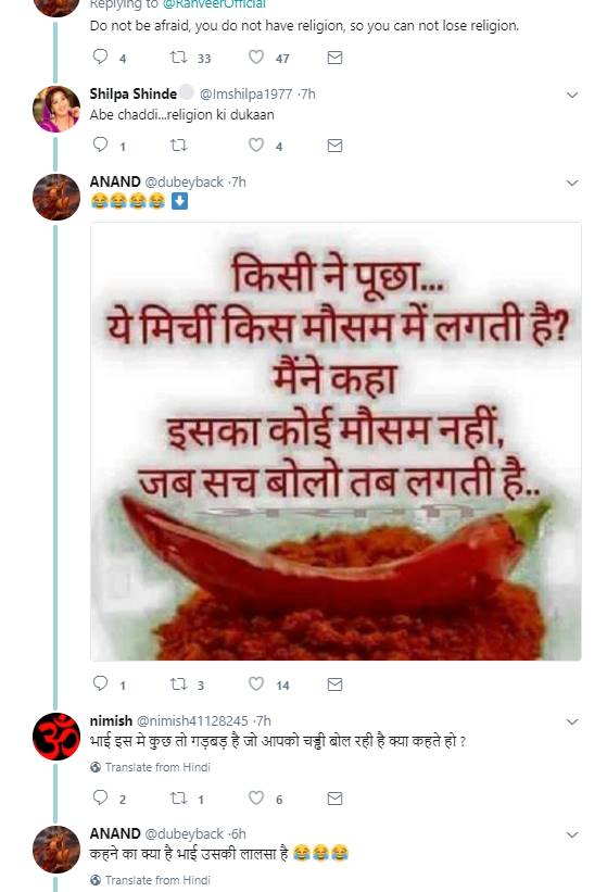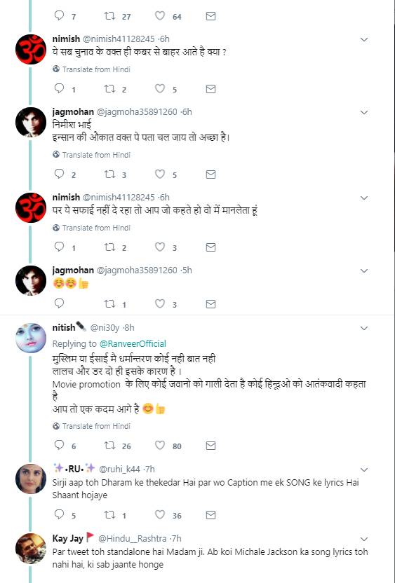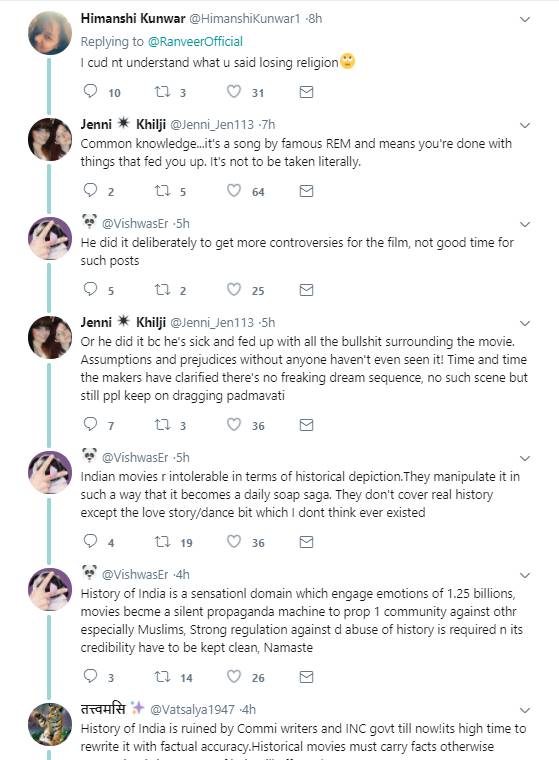 कई लोगों ने कहा कि वह ‘पद्मावती’ को लेकर एक और विवाद जोड़ रहे हैं तो कई लोगों ने रणवीर को अपने धर्म को लेकर ऐसी बात करने के कारण काफी खरी-खोटी सुनाई। यहां देखें ट्वीट्स-