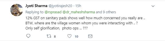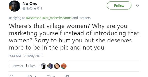 तस्वीर में रविशंकर के साथ केंद्रीय मंत्री महेश शर्मा सहयोगियों के साथ बैठे दिखे, जबकि कोई महिला साथ नहीं थी, जिनके साथ संवाद का दावा किया गया था। इस परसोशल मीडिया यूजर्स ने ट्रोल करना शुरू कर दिया।यशस्वी नामक ट्विटर यूजर ने लिखा-आपने उन महिलाओं को कहां छुपा रखा है महराज। नो वन नामक ट्विटर हैंडल ने कहा-गांव की महिलाएं कहां हैं, आप गांव की महिलाओं का परिचय कराने की जगह अपनी मार्केटिंग क्यों कर रहे हैं, माफ करिएगा महिलाएं तस्वीर में शामिल होने की ज्यादा हकदार हैं। ज्योति शर्मा ने लिखा-सैनिटरी नैपकिन पर 12 प्रतिशत जीएसटी दिखाता है कि आप इसको लेकर कितना गंभीर हैं, फिर भी कहां हैं वे महिलाएं, जिनसे आपने संवाद किया।